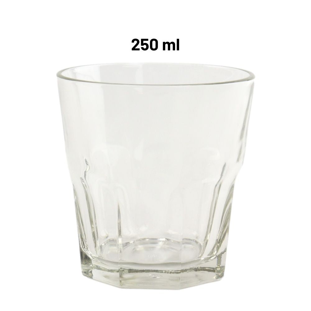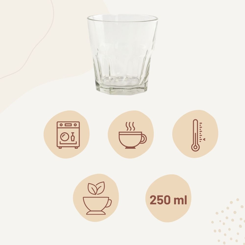 Deze set glazen bestaat uit 4 geharde waterglazen met een inhoud van 250 milliliter. De afmetingen van de glazen zijn 7,5 x 8,5 centimeter. De glazen zijn vaatwasser bestendig.