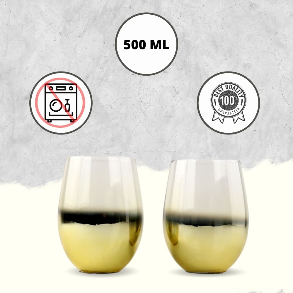 Klassieke waterglazen. De set bestaat uit 2 glazen. De glazen hebben gouden details aan de onderkant. De inhoud van de glazen is 500 ml. De afmetingen zijn 12 x 7.5 x 7.5 cm. Advies is om de glazen met de hand af te wassen.