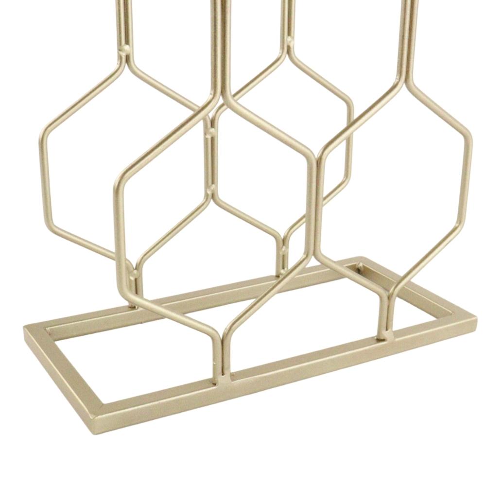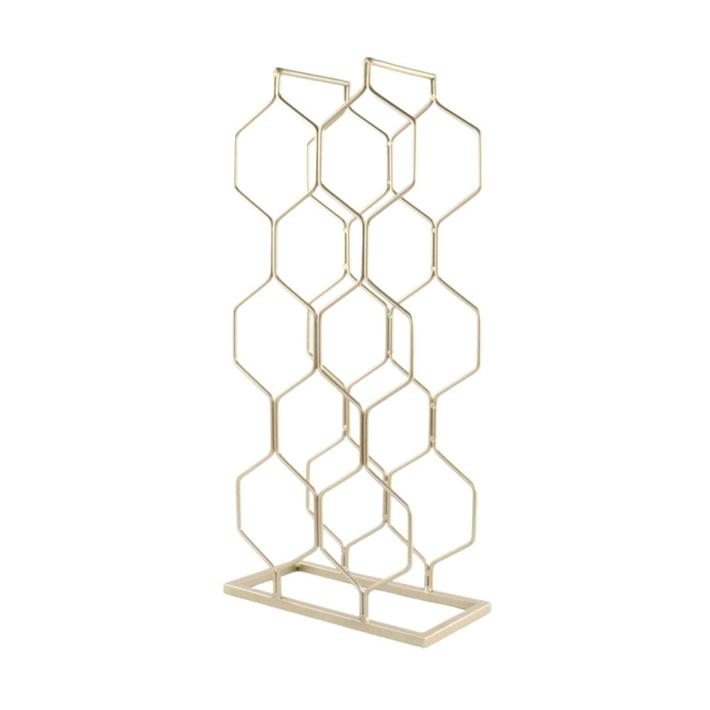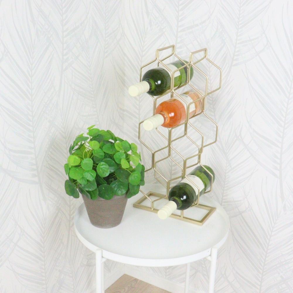 Dit wijnrek metaal goud van Orange85 heeft een strak en modern design. Het rek heeft een honinggraat vorm. In dit rek is plek voor 8 flessen wijn. Het rek staat stabiel op de grond. De hoogte van dit rek is 48.5 cm.