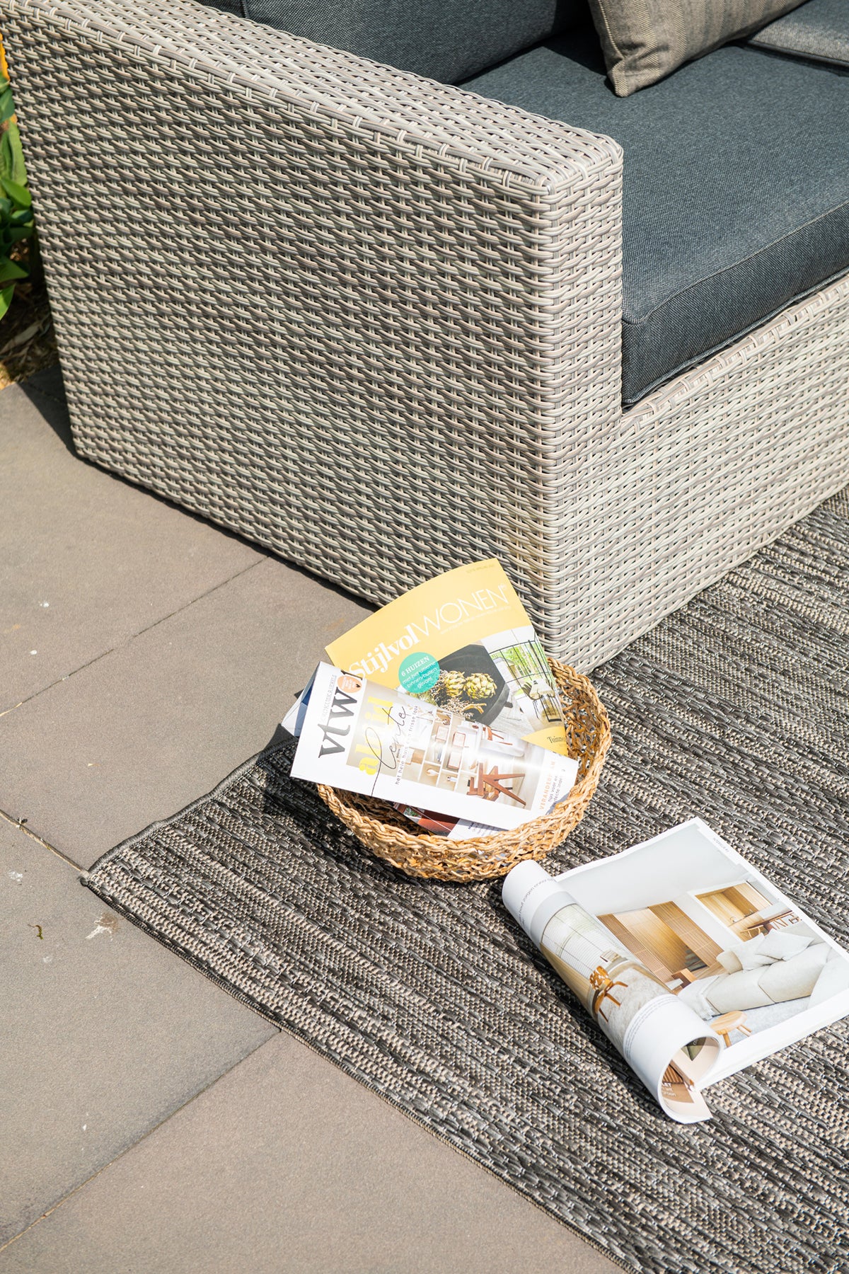 Tijdloze wicker loungeset De set heeft een aluminium binnenframe, omhuld met handgevlochten kunststof vlechtdraad. Het dubbele draad heeft een luxe uitstraling en is sterk, onderhoudsvriendelijk en bestand tegen verschillende weersomstandigheden. De kussens worden standaard meegeleverd. Dankzij de vuil- en waterafstotende coating kunnen de kussens een klein regenbuitje prima verdragen.