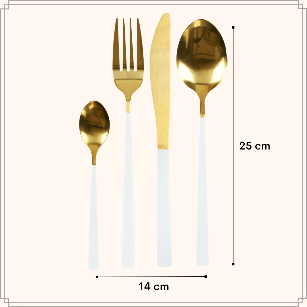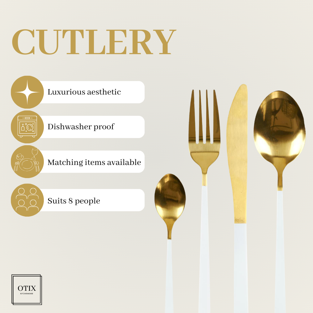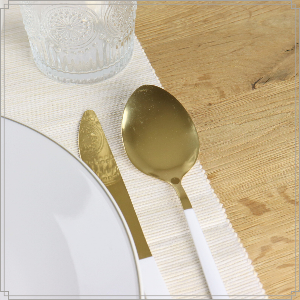 Voeg een vleugje luxe en verfijning toe aan je tafel met de OTIX Bestekset in een prachtige goudkleur met witte accenten. Deze 48-delige bestekset is geschikt voor 8 personen en is perfect voor dagelijks gebruik en speciale gelegenheden. Elke set bevat 8 vorken, 8 messen, 8 lepels en 8 dessertlepels, allemaal gemaakt van hoogwaardig roestvrij staal (RVS). Let op! De bestekset is niet vaatwasbestendig. Dit kan de witte coating aantasten