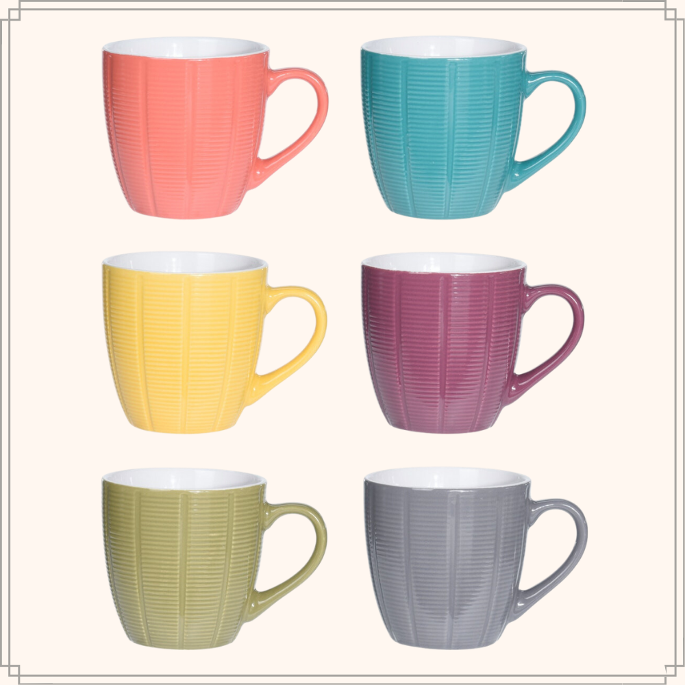 Drink jouw koffie uit deze prachtige, vrolijke mokken met een gestreept reliëf. De set bestaat uit 6 verschillende kleuren. De gekleurde koffiemokken hebben een inhoud van 200 ml. Ze zijn geschikt om in de vaatwasser te doen.