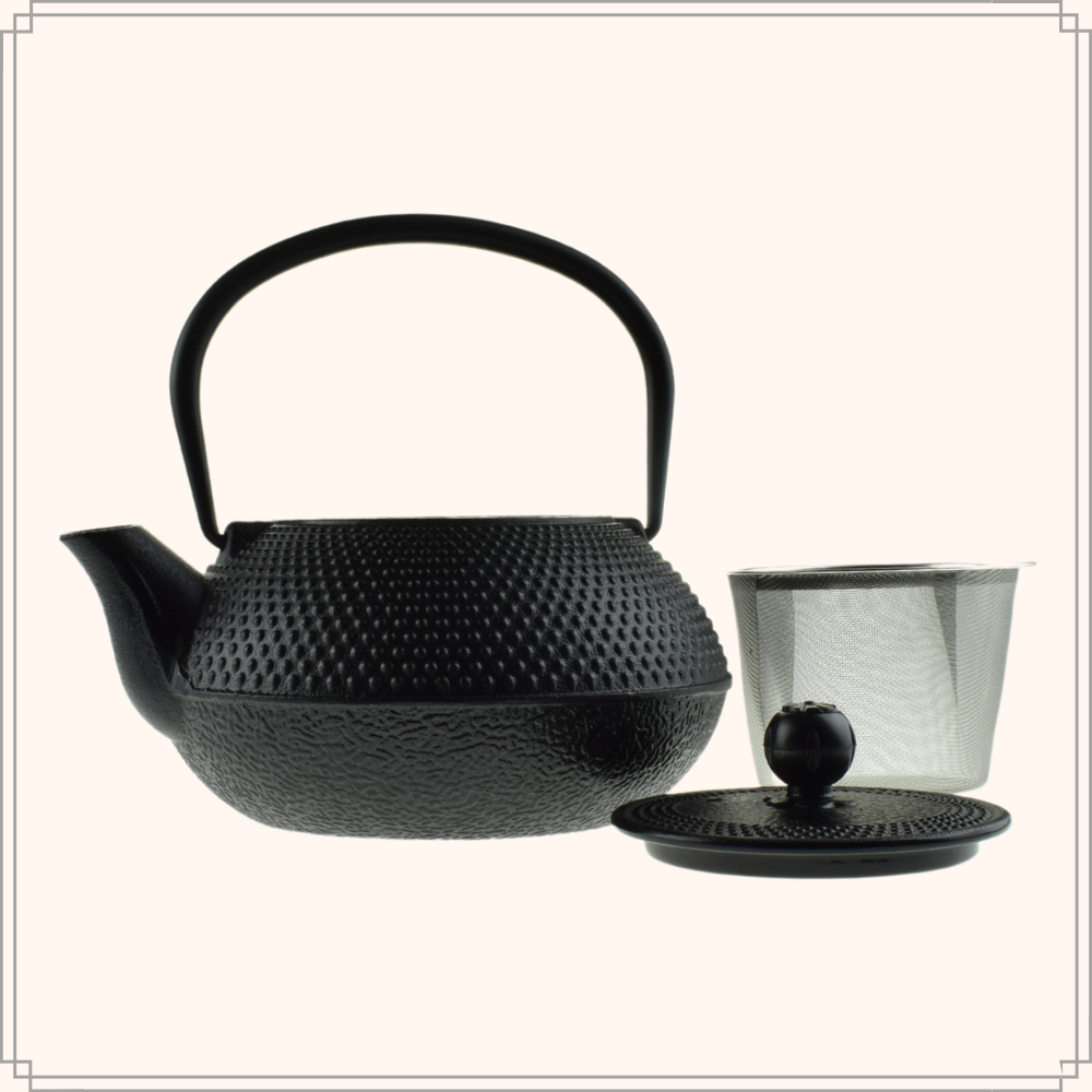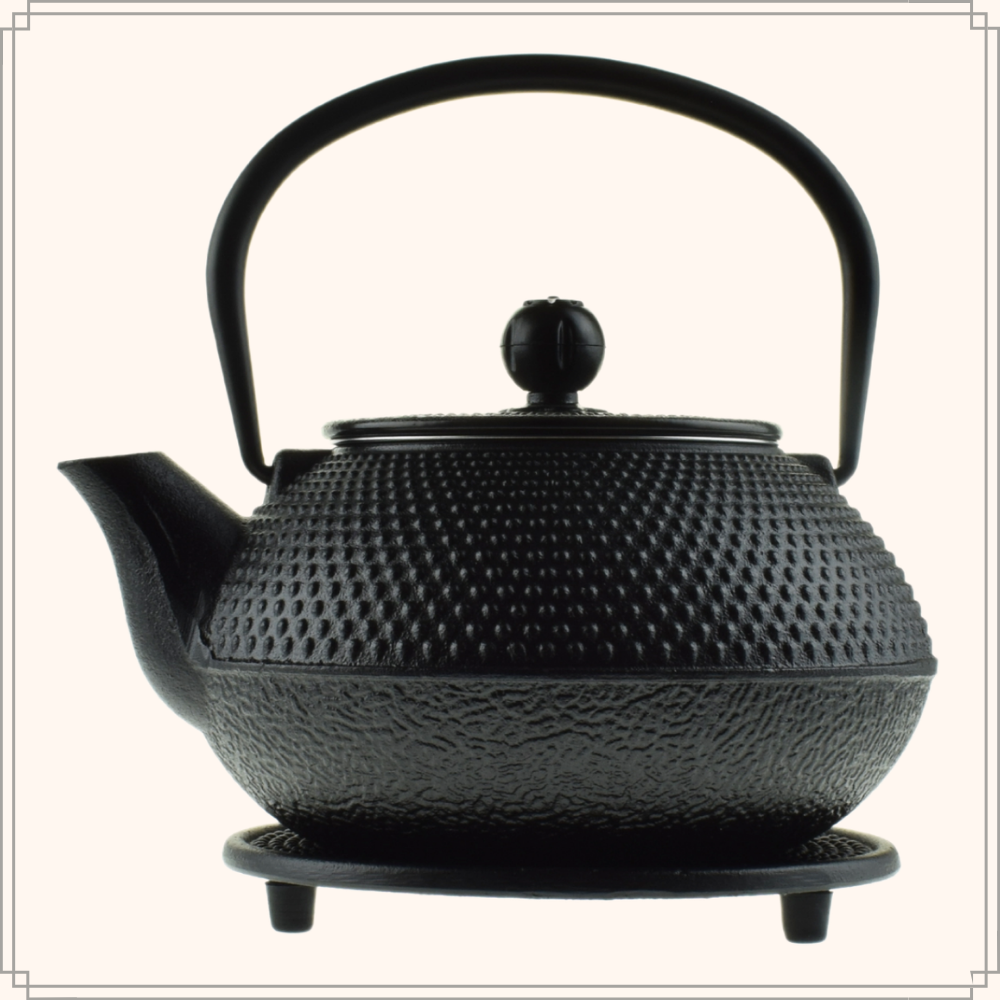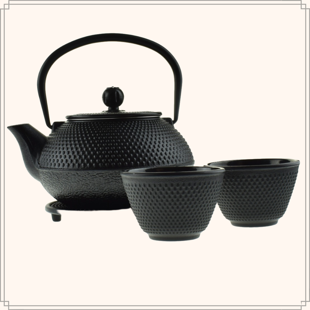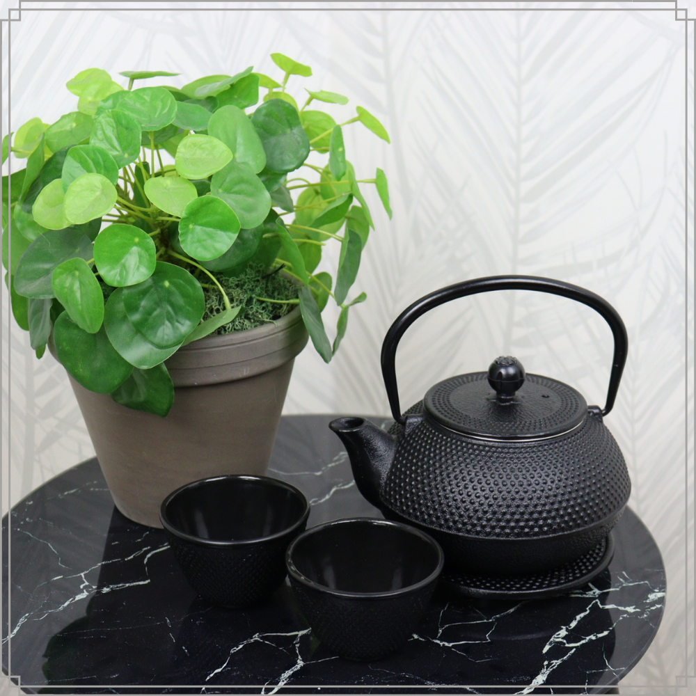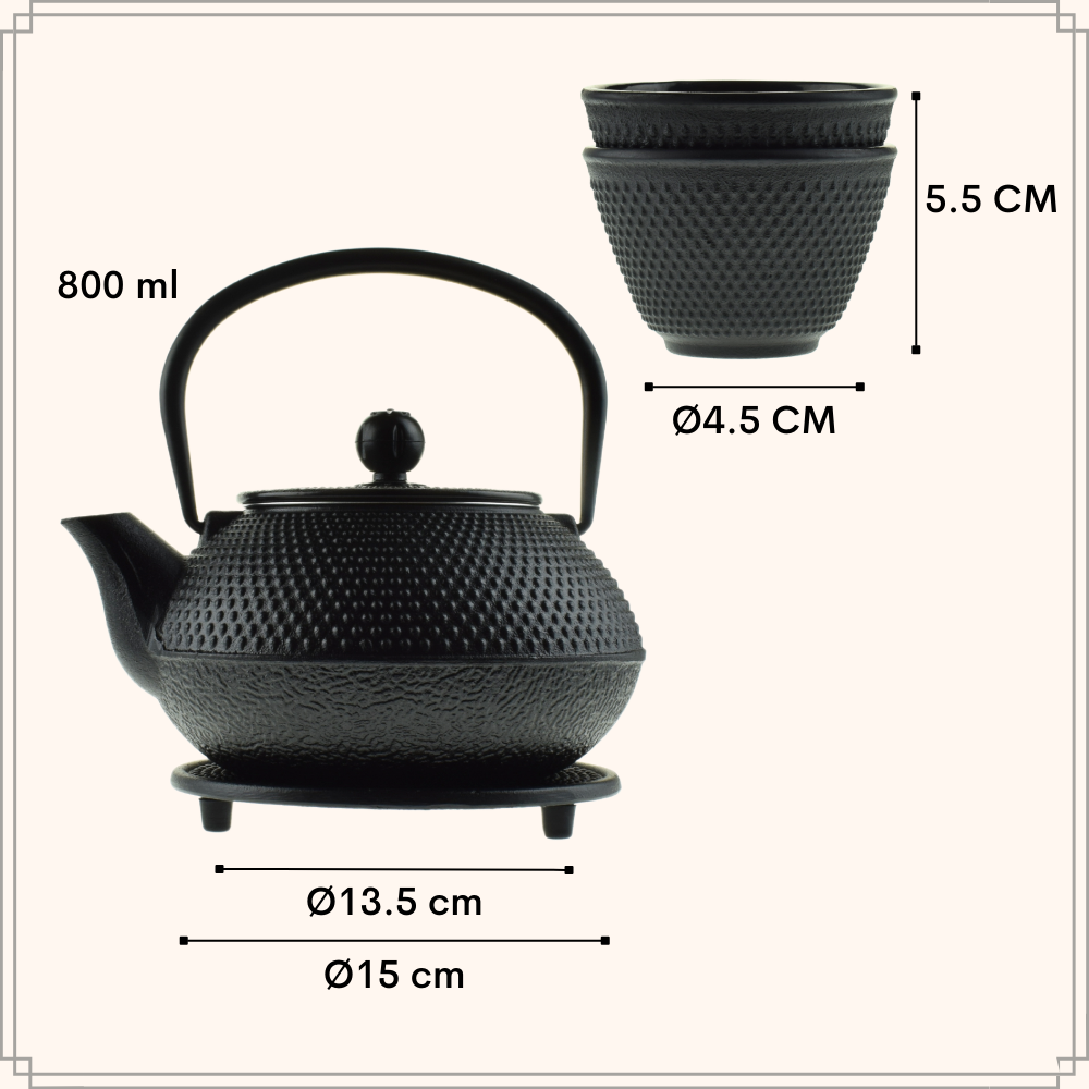 De Theepot Set 4-delig bestaat uit een theepot, twee theekopjes en een onderzetter. De set is in fraai Japans design en gemaakt van gietijzer. De inhoud van de theepot is 800 ml en bevat een zeefje waar je de thee in kunt doen. De theekopjes hebben de inhoud van 100 ml.