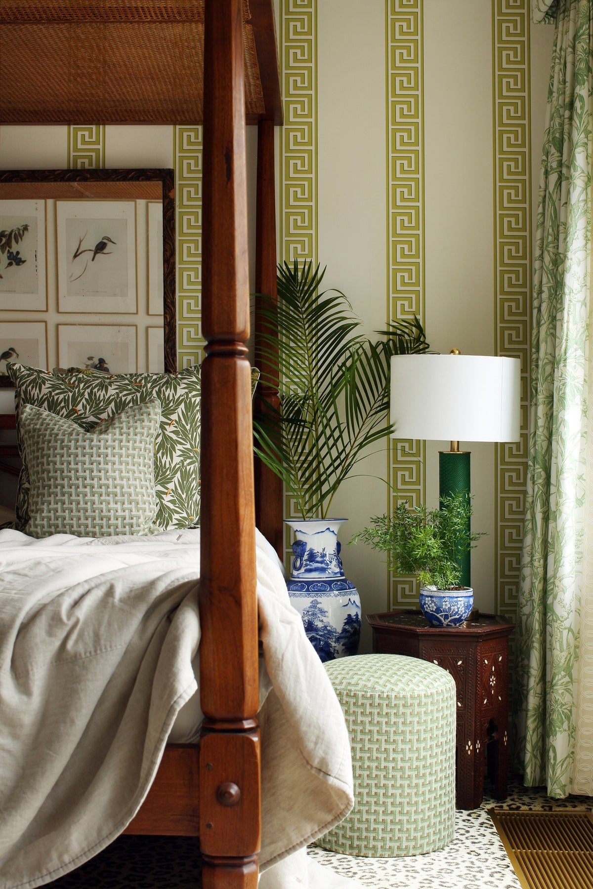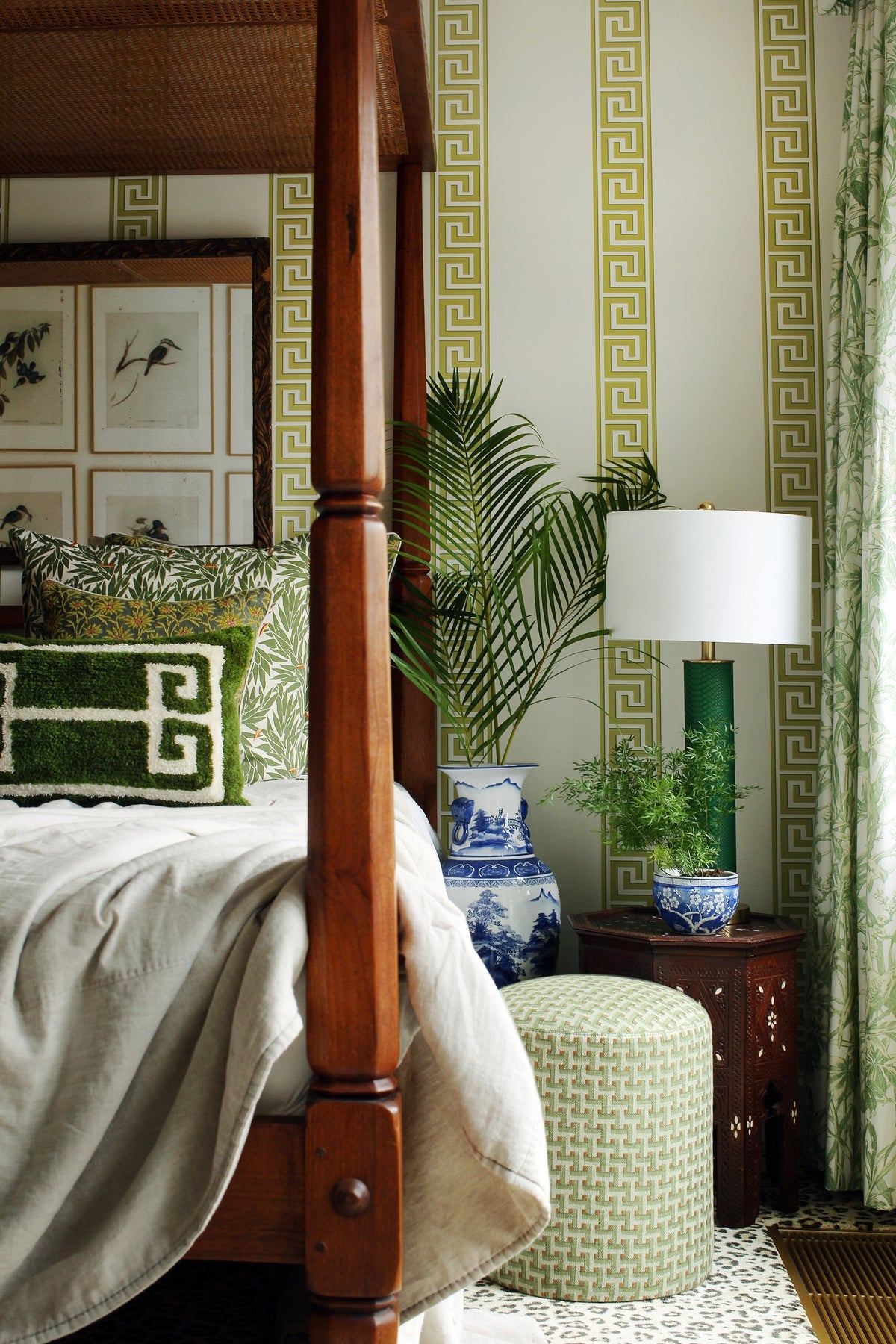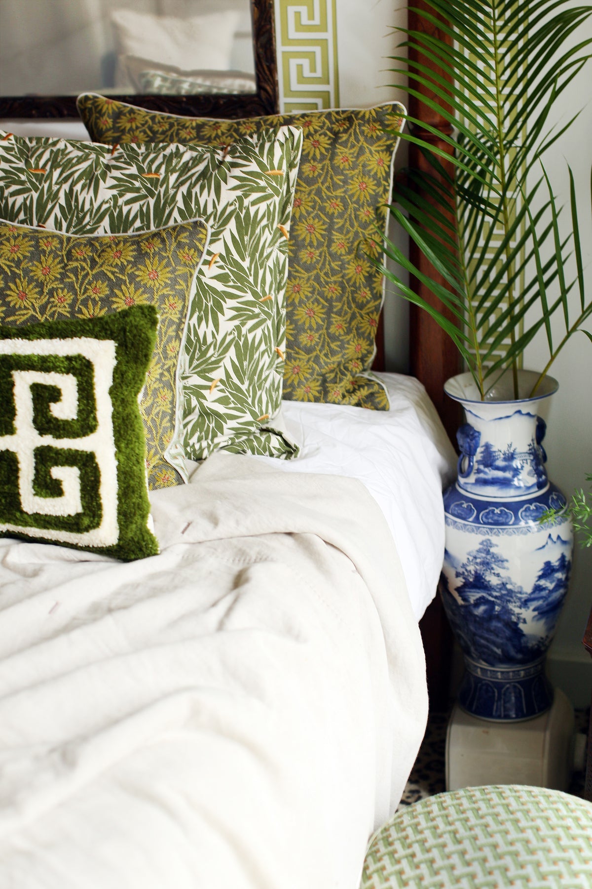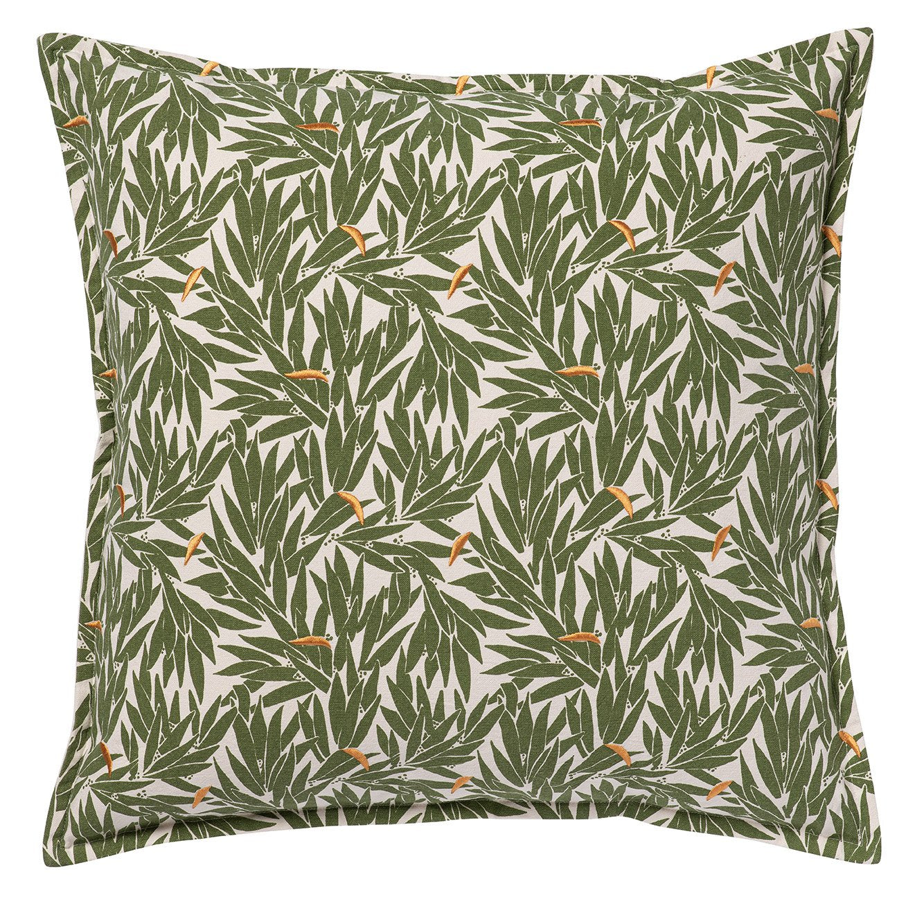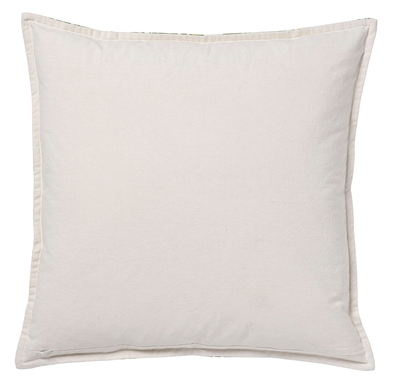 Yoko's klassieke bamboe patroon is geïnspireerd door een antieke stof die ooit praalde op een Frans landgoed en nu door meesterprinters uit India op het kussen is geprint. Yoko is gemaakt van biologisch katoen en bevat fijne details van oranje blaadjes die op het kussen geborduurd zijn.