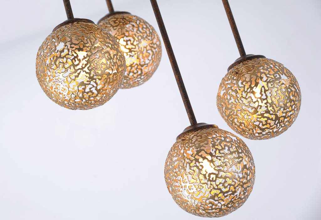 De metalen delen zijn donkerbruin, bewust geroest. Zie verder voor meer artikelen in deze serie. Dit armatuur heeft vijf G9-fittingen maar worden de lichtbronnen er niet automatisch bijgeleverd.