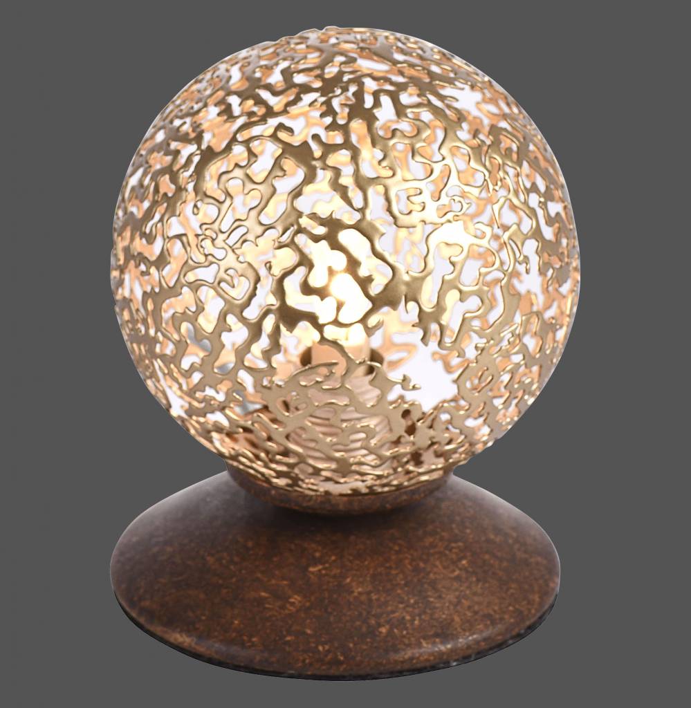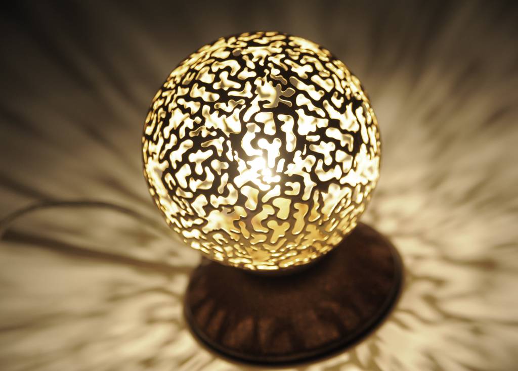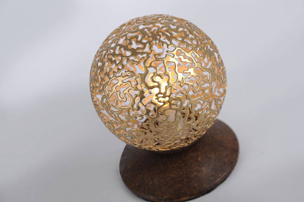 De ronde, goudachtige kogel is vakkundig gefreesd wat een een waanzinnig lichteffect geeft op de omgeving nabij het armatuurtje. Het metaal is donkerbruin, bewust geroest. Zie verder voor meer artikelen in deze serie.