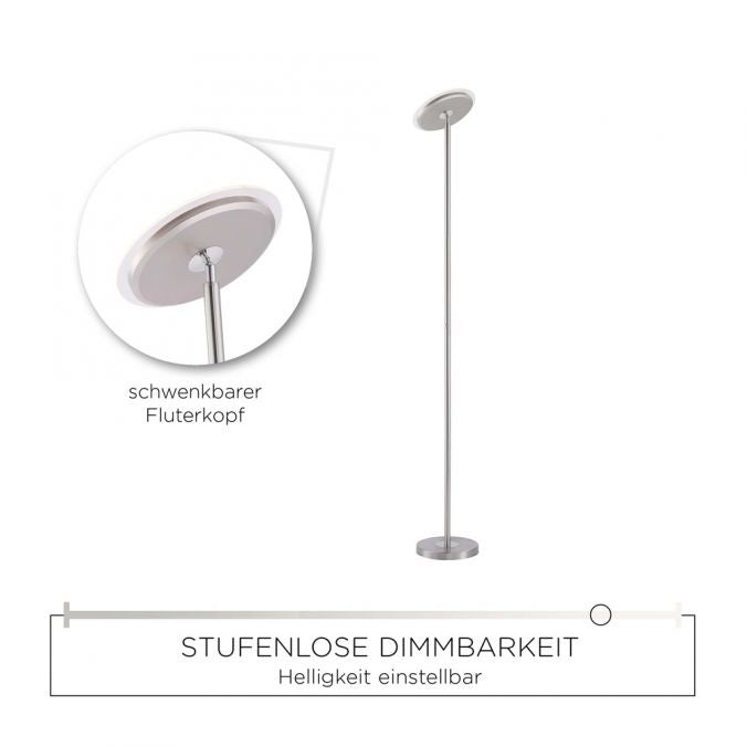 Qua helderheid dim je de vloerlamp met de geïntegreerde touchdimmer. De indrukwekkende uplighter heeft een kogelgewricht waardoor je de lichtinval individueel kunt aanpassen. Dankzij de gebruikte LED-technologie wordt de vloerlamp gekenmerkt als energiebesparend en overtuigt met een lage warmteontwikkeling en een lange levensduur.
