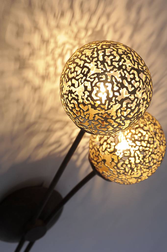 De twee ronde, goudachtige kogels zijn vakkundig gefreesd wat een een waanzinnig lichteffect geeft op de wanden en het plafond in de buurt van het armatuur. De metalen delen zijn donkerbruin, bewust geroest. Zie verder voor meer artikelen in deze serie. Dit armatuur heeft twee G9-fittingen maar worden de lichtbronnen er niet automatisch bijgeleverd.