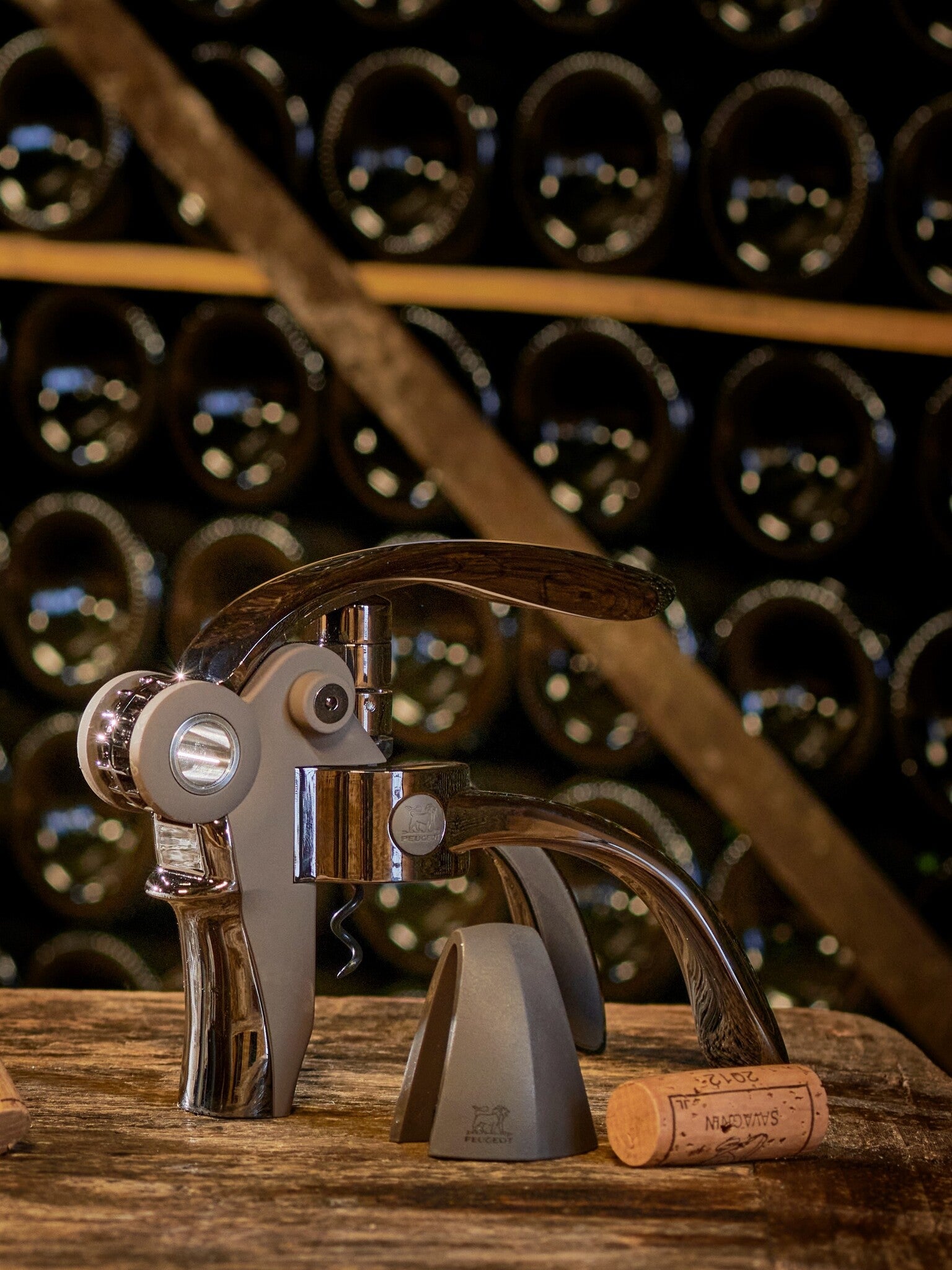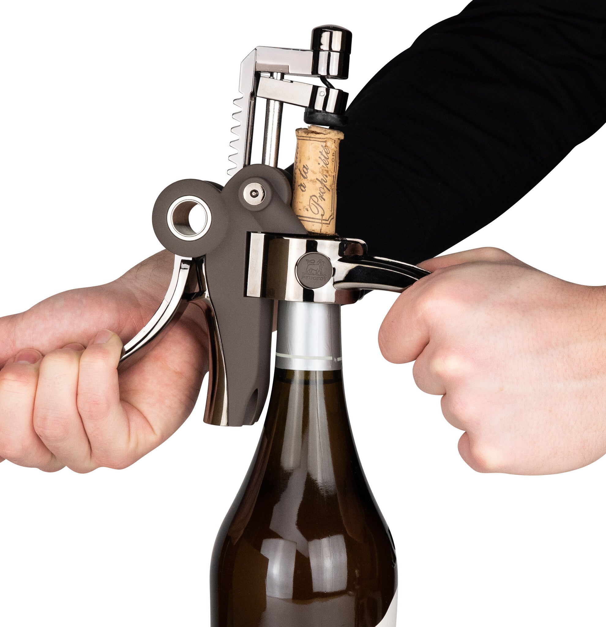 - De grijpers aan de opener houden de fles stevig vast terwijl je de kurk verwijdert