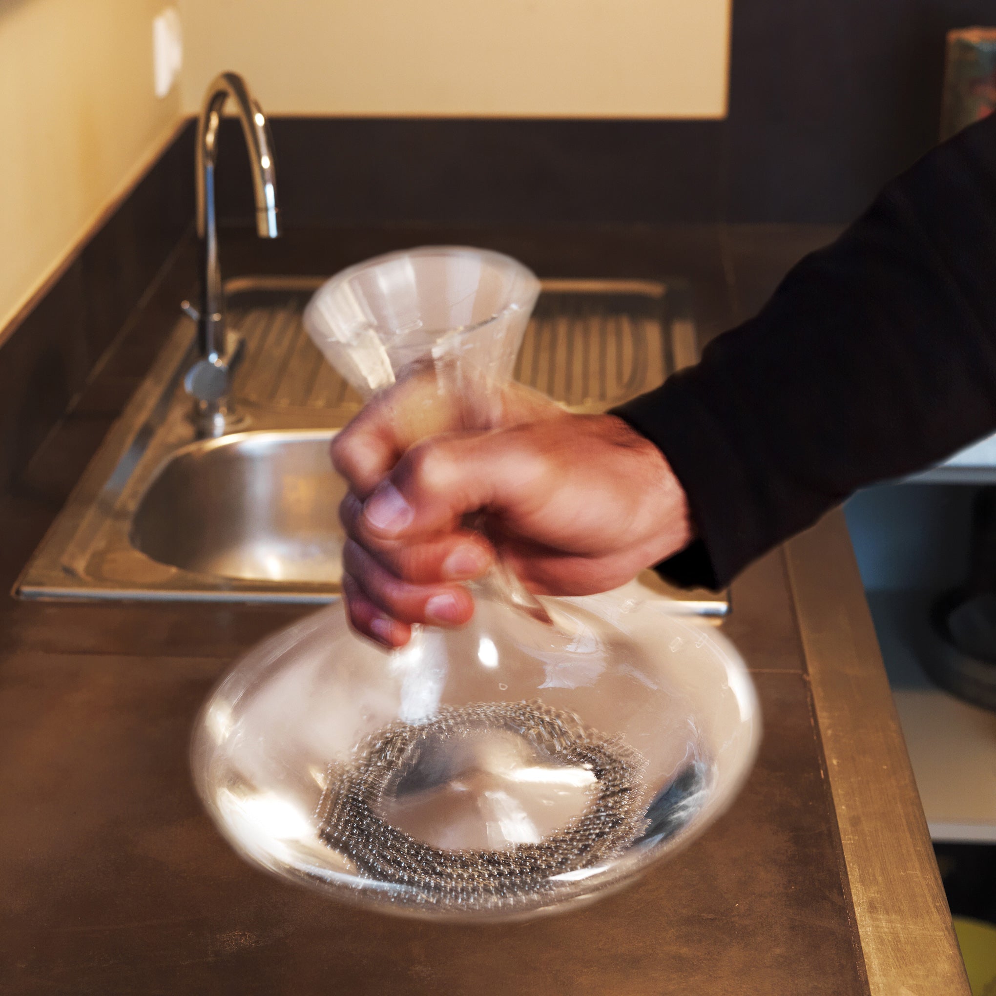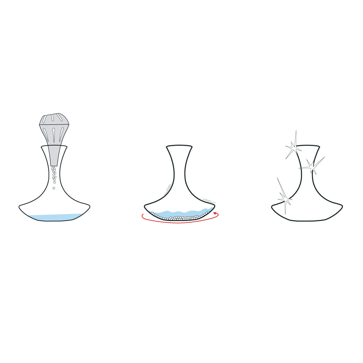 Hoe werkt het? Vul de karaf met een bodempje warm water en voeg de metalen balletjes toe. Maak rustige draaibewegingen met de karaf; door de wrijving verwijderen de kogeltjes alle kalkaanslag en tanninevlekken. Karaf schoon? Vang de balletjes weer op in het flesje, spoel ze even af en laat ze afdruipen.