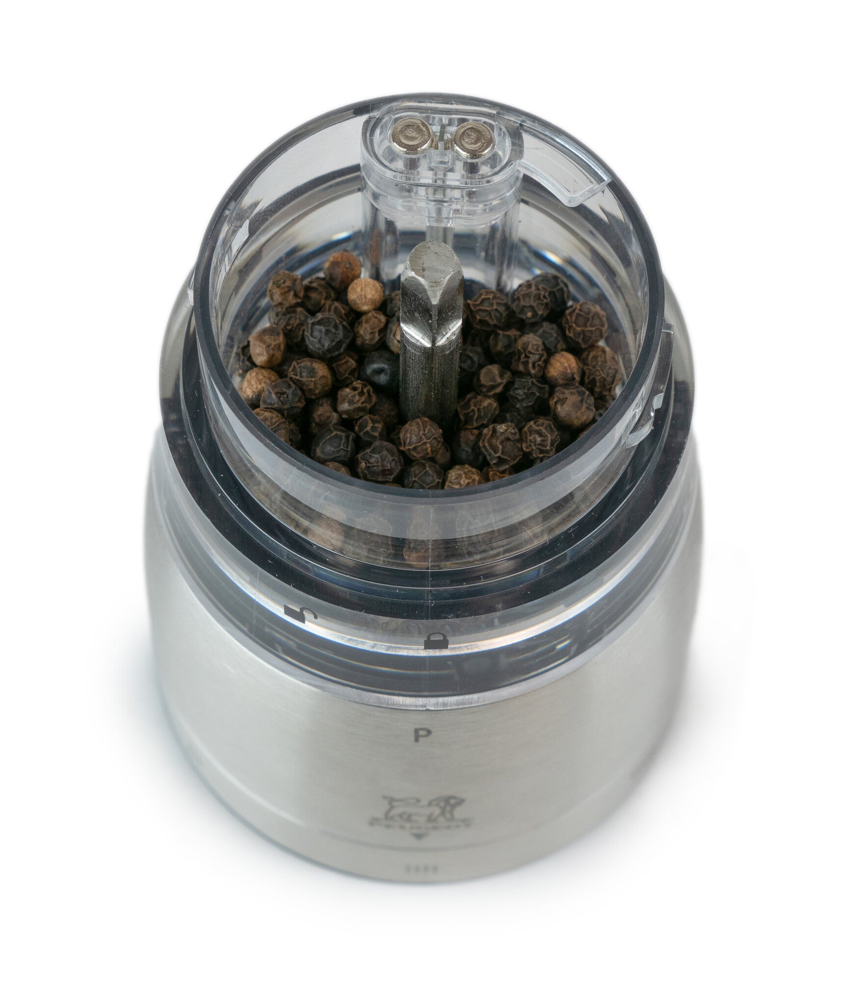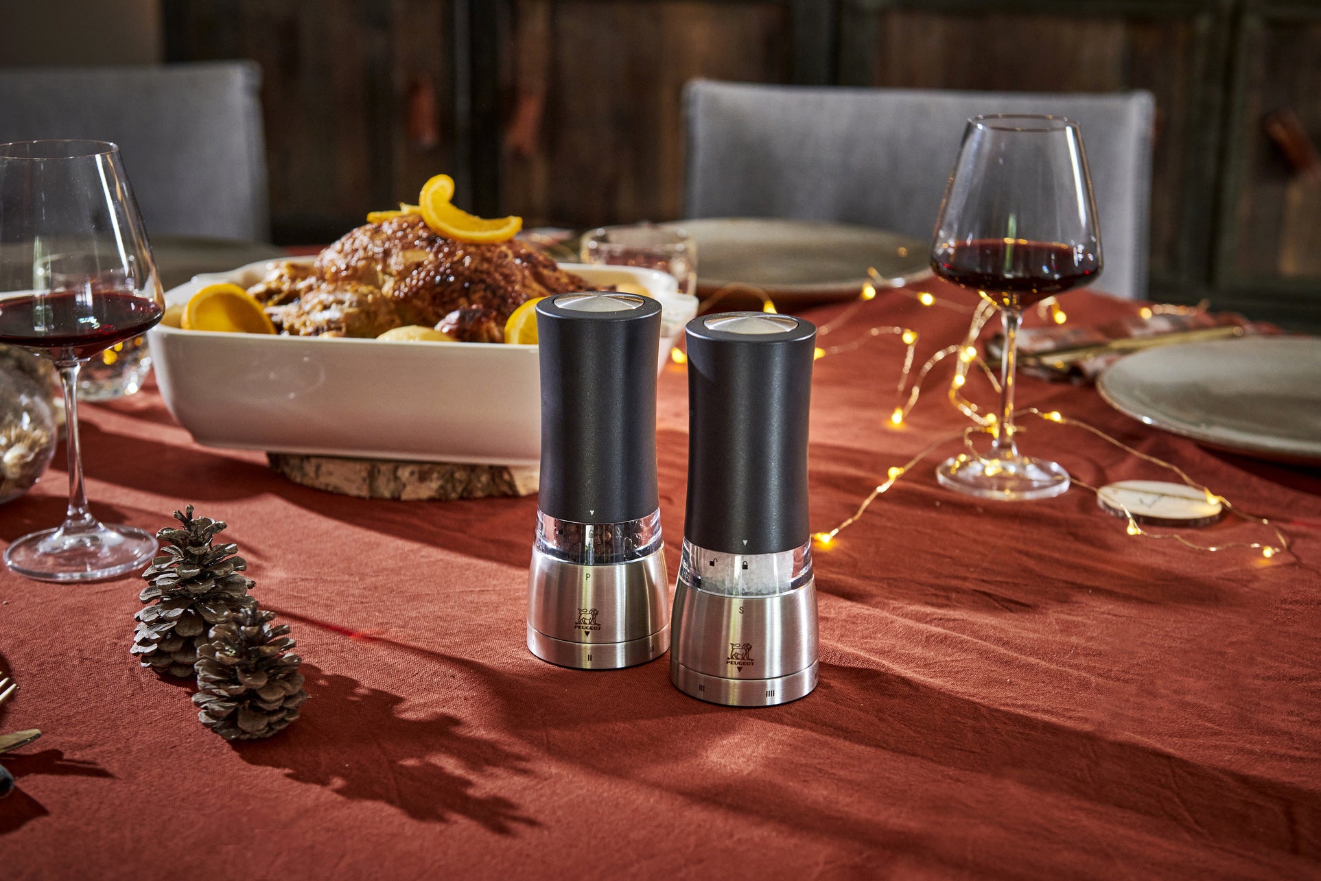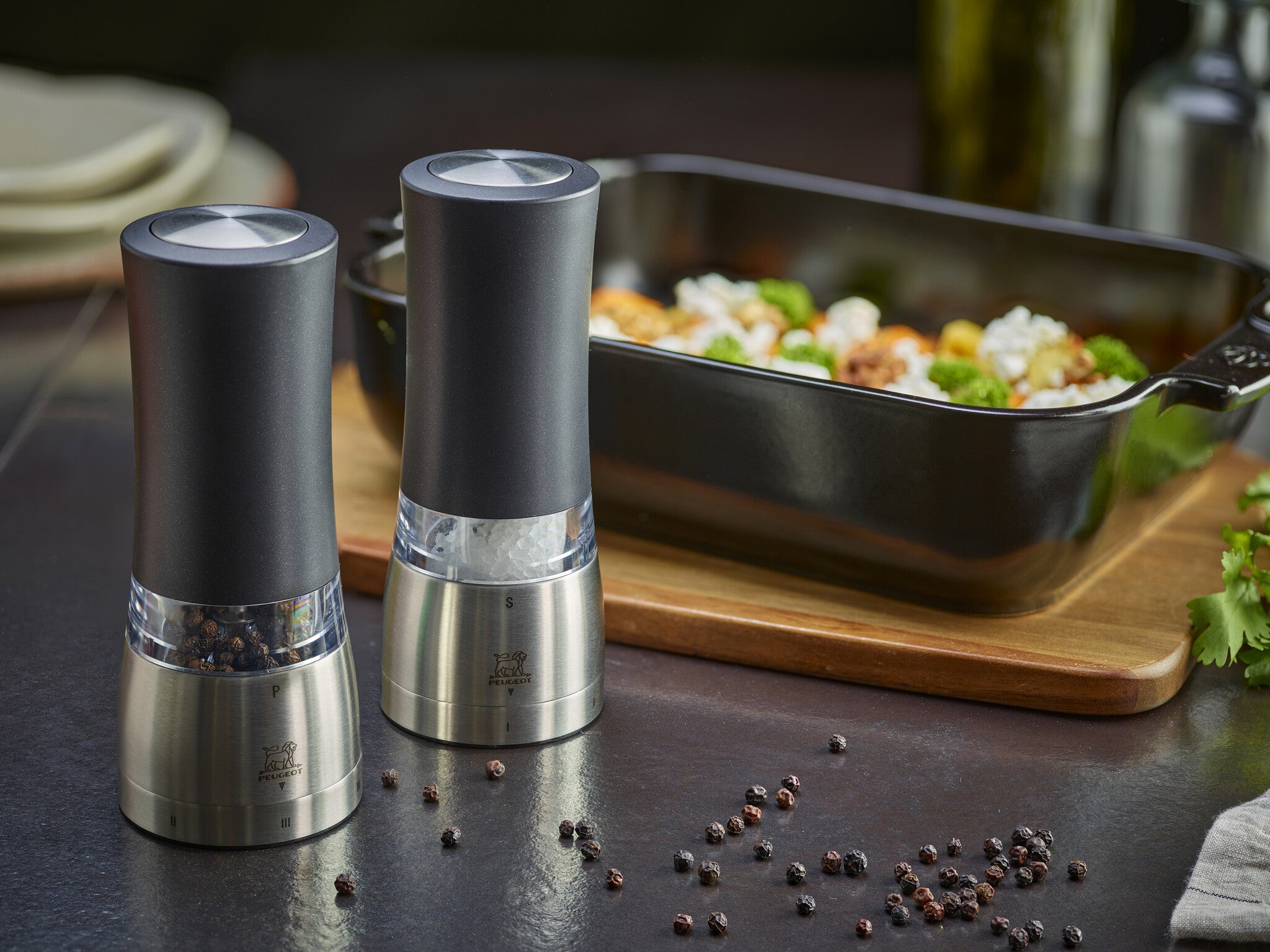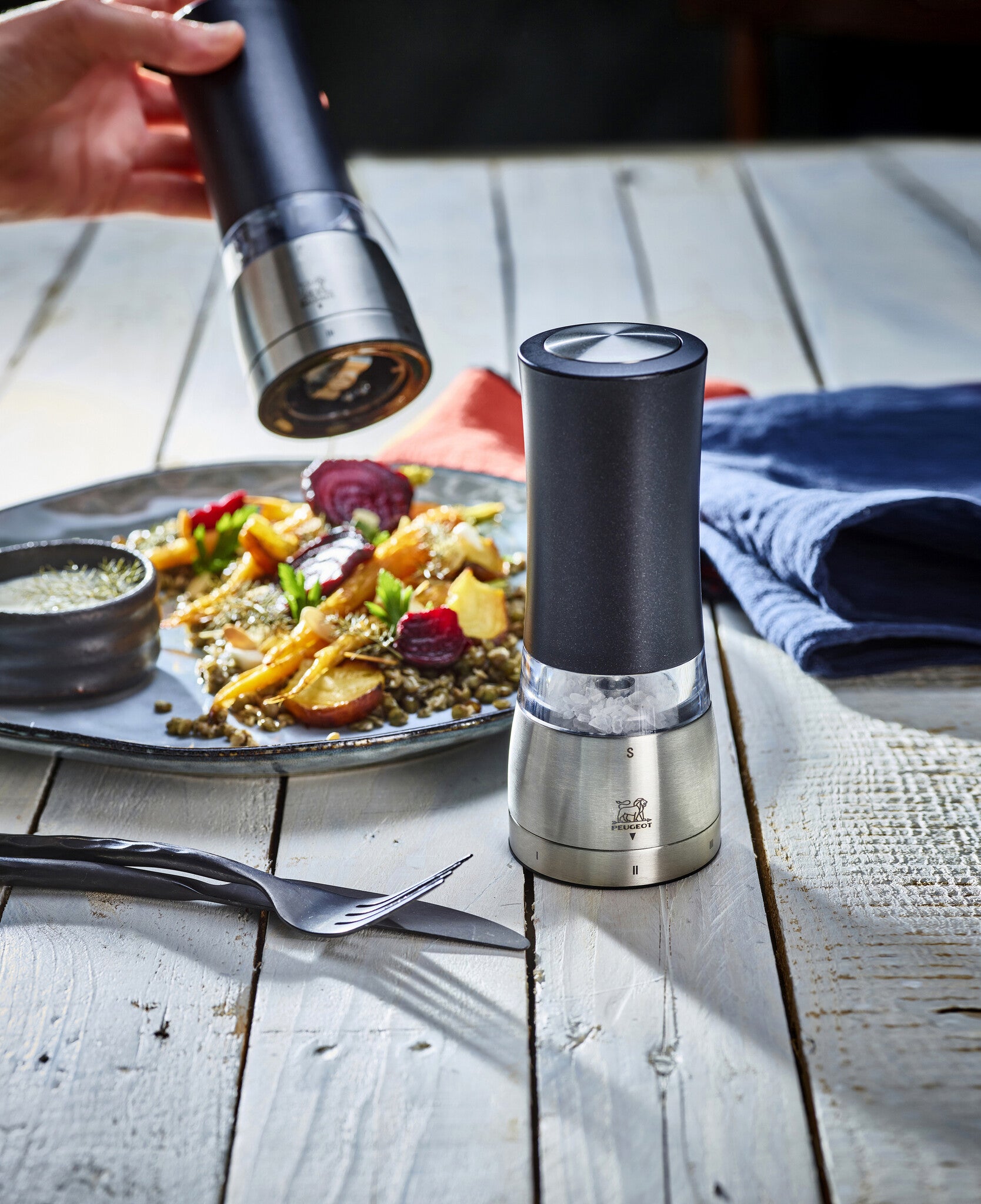 - Met een simpele druk op de knop malen de 16 cm hoge molens zout- en peperkorrels over elk gerecht