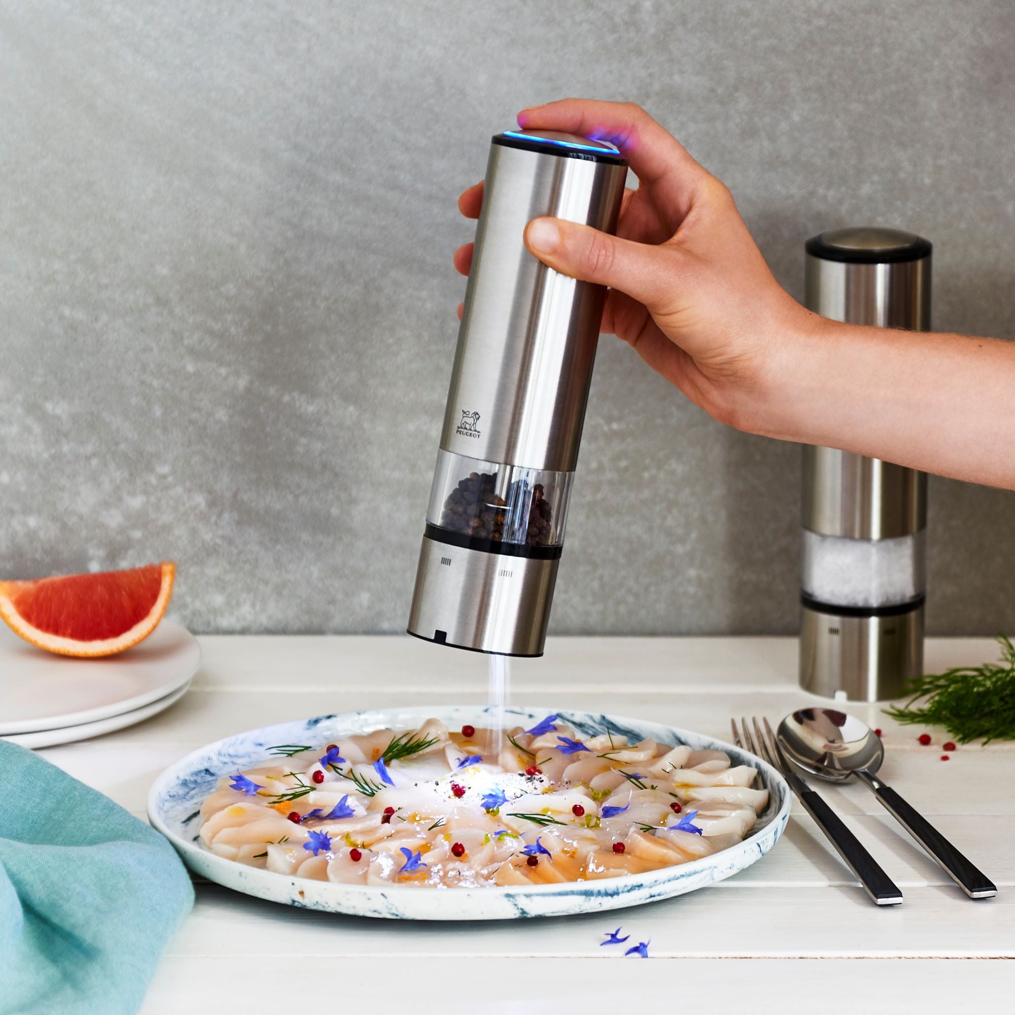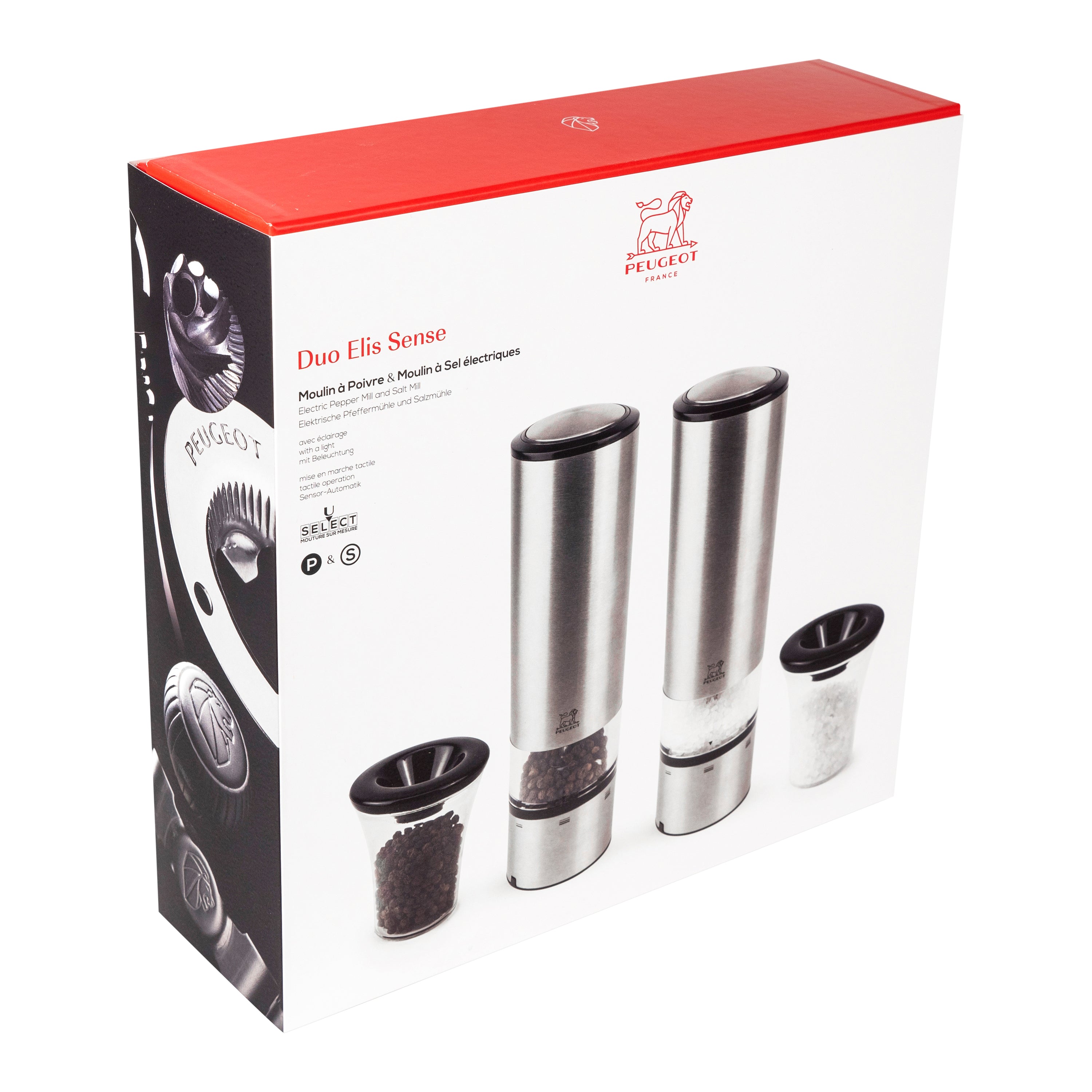 Peugeot Elis Sense Elektrische peper- en zoutmolens De Elis sense elektrische zout- en pepermolen zijn vervaardigd uit sterk, mat geborsteld RVS en hebben een strak, eigentijds design. De molens zijn elektrisch waardoor ze makkelijk met één hand te bedienen zijn. Door de gladde vormgeving ligt de Elis sense prettig in de hand en is hij makkelijk bij te vullen. Door de acryl rand kan je altijd goed zien hoeveel peper of zout er nog in de molen zit.