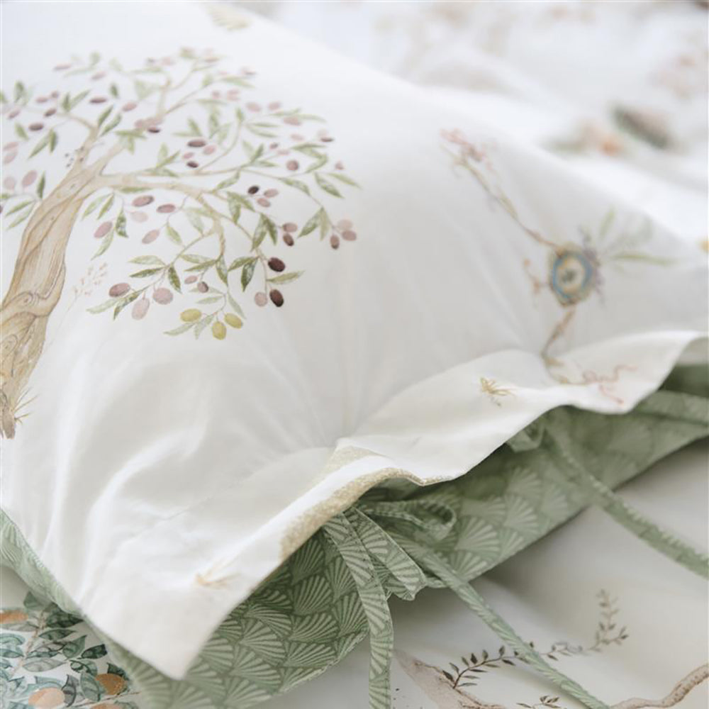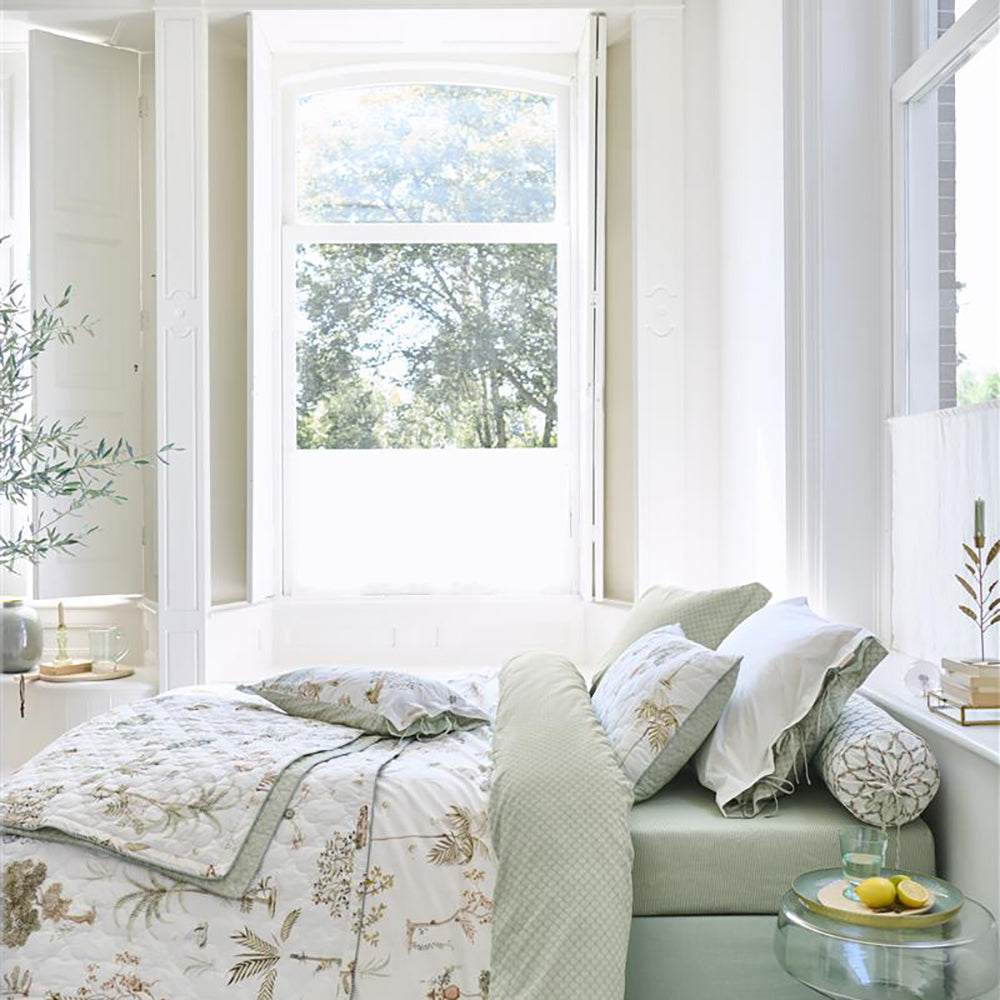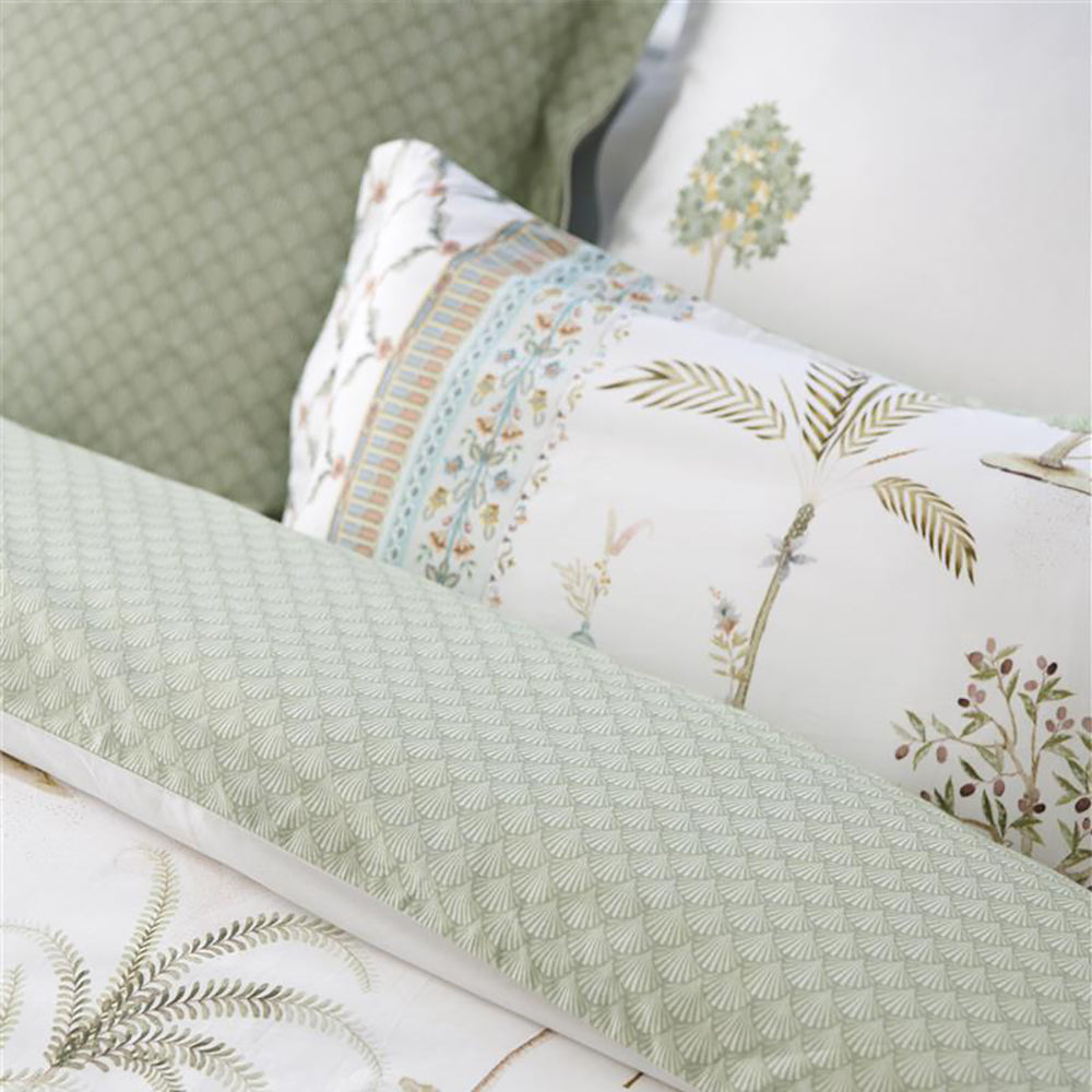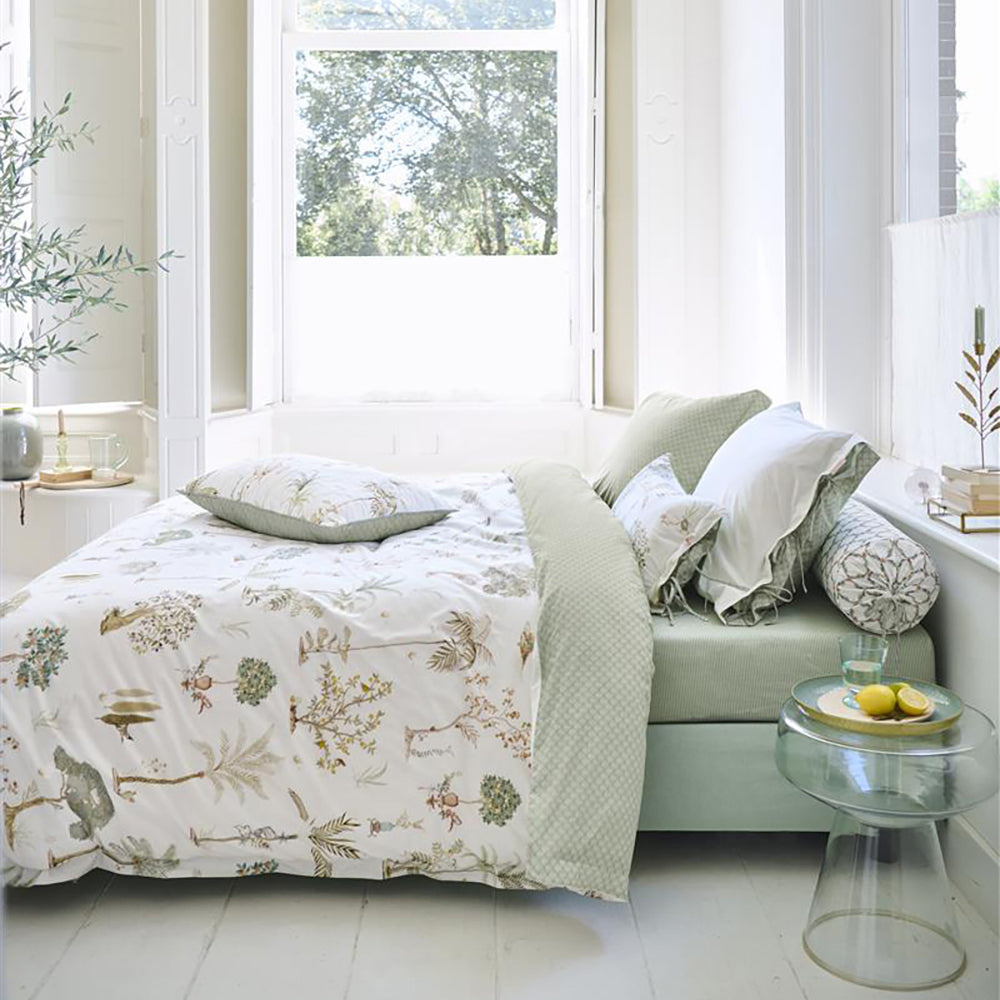 Waarom dekbedovertrek Giardini di Frutta? Met dit dekbedovertrek Giardini di Frutta waan je jezelf op het Italiaanse platteland. Het dessin bevat een mix van palm- en fruitbomen en tussen de bomen zijn verwijzingen naar het Italiaanse buitenleven te vinden zoals fonteinen, terracotta potten en guirlandes en hier en daar een olijfplukker. De onderkant van het dekbed heeft een decoratieve rand die overgaat in een bloemenprint. De achterkant heeft een patroon van gestileerde schelpen. Het overtrek en de kussens hebben een doorgestikte rand aan de zijkanten en zijn afgewerkt met een gestreepte bies, dit geeft een luxe uitstraling. De kussenslopen hebben een striksluiting en net als het overtrek twee verschillende kanten en kun je tweezijdig gebruiken. Zo creeër je een speels mix & match effect op je bed. Het dekbedovertrek is niet alleen een blikvanger in je slaapkamer, door het gebruik van 100% katoenperkal is het overtrek heerlijk zacht en door de weefdichtheid van 200TC blijft de stof lang mooi. Het overtrek maak je eenvoudig op dankzij de extra lange instopstrook over de gehele breedte. Je kan het overtrek wassen tot 60 graden, strijken en is geschikt voor de wasdroger. Hoewel de hoogwaardige kwaliteit ervoor zorgt dat strijken eigenlijk niet nodig is.