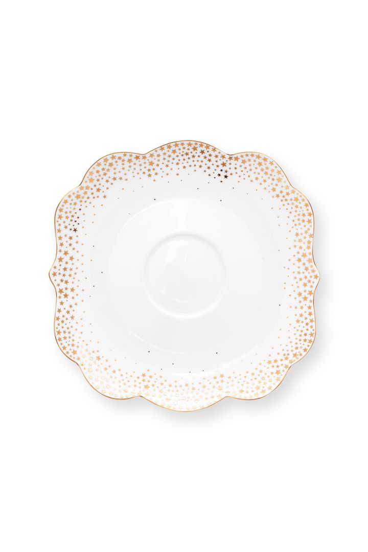 - De set bestaat uit 2 kopjes en 2 schoteltjes en komt in de kleur wit met goud.