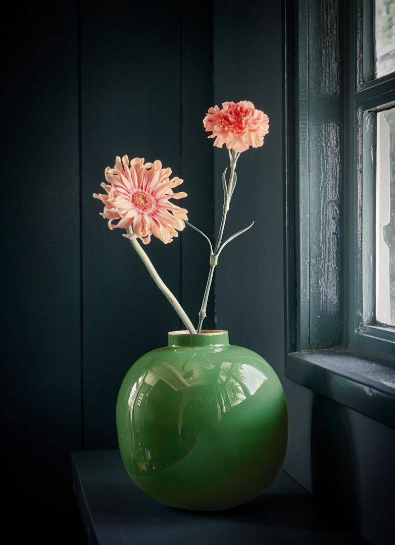 - De groene metalen bloemenvaas kan wel tegen een stootje!