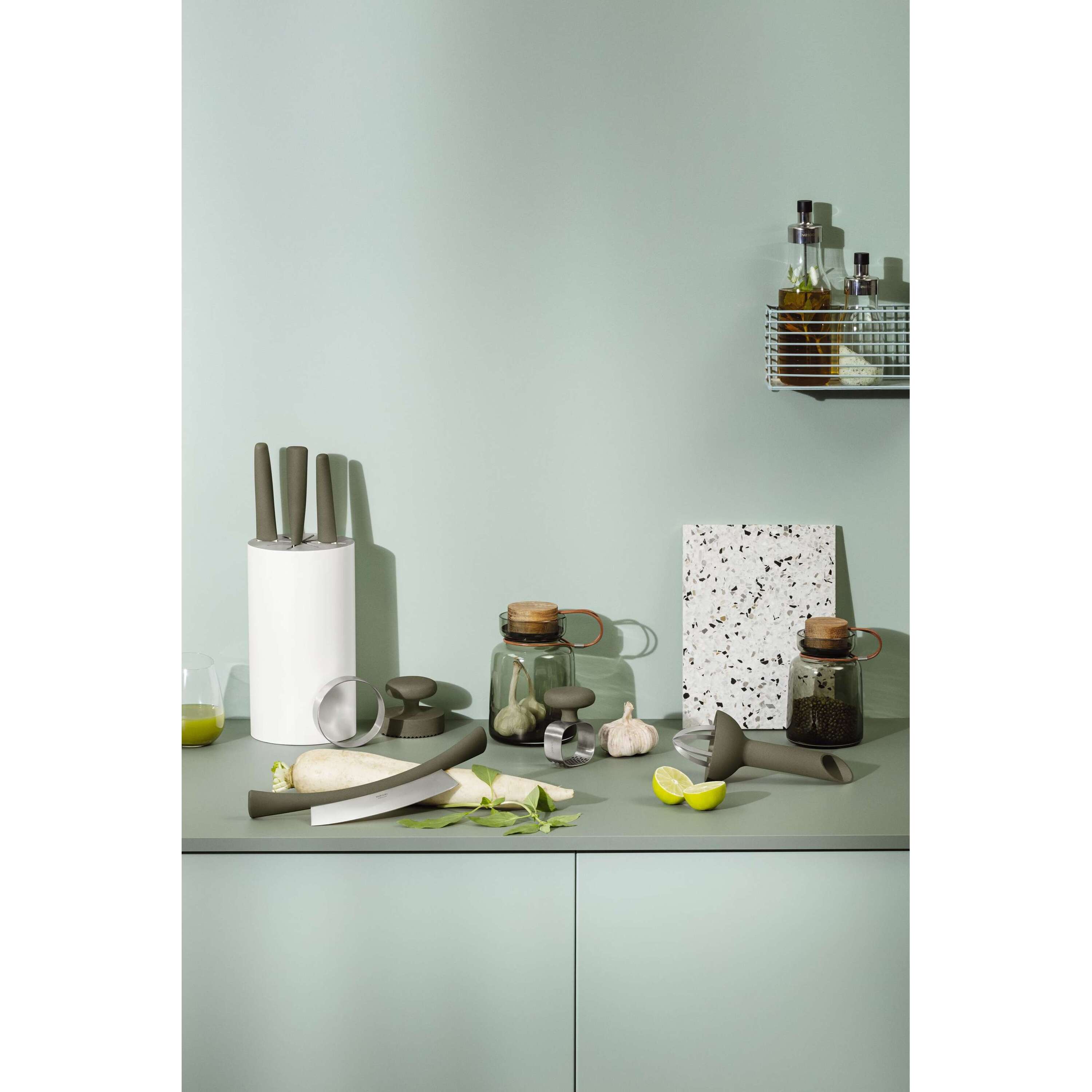 Het Green Tool pizza/kruiden mes van Eva Solo is een goede aanvulling in iedere keuken. Het gebogen mes maakt het hakken van kruiden en het snel snijden van pizza extra eenvoudig. Door de lange greep is hij comfortabel en stevig vast te houden waardoor je gemakkelijk wiegende bewegingen met het mes kunt maken. De Green Tool serie van Eva Solo bevat handgrepen van komposiet welke van duurzaam materiaal gemaakt zijn waarbij 50 % van het plastic is vervangen voor tarwevezels. Hierdoor levert de Green Tool serie een mooie bijdrage aan een groenere leefstijl.