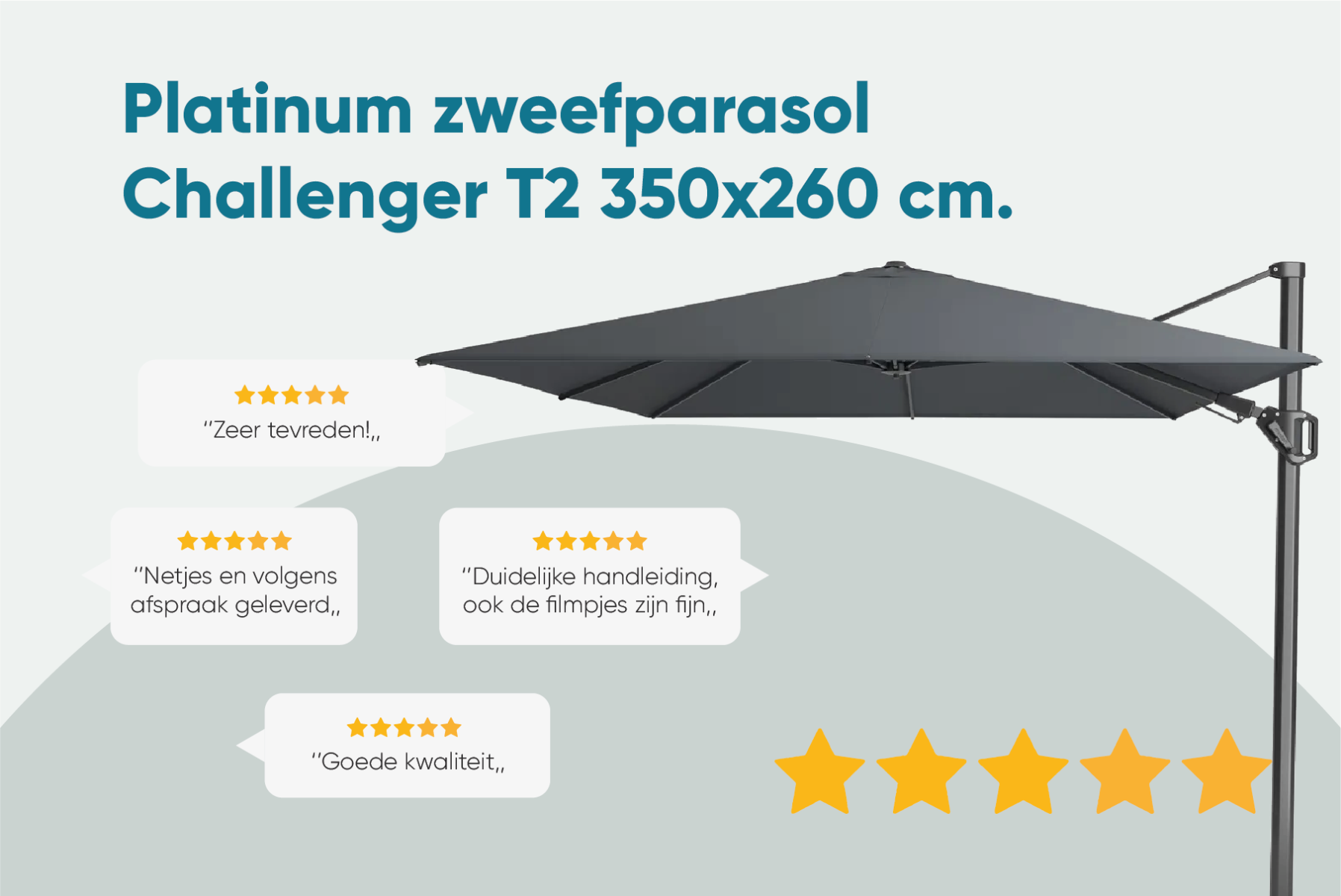 Op zoek naar een zweefparasol met bijpassende voet en hoes? Dan is de Platinum Challenger T2 3.5x2.6m. een aanrader. Deze grote zweefparasol wordt geleverd met een bijpassende parasolvoet van 90 kg. en een beschermhoes. De challenger heeft een antraciet frame en een Havanna Taupe parasoldoek. Het frame is gemaakt van aluminium. Dit materiaal is erg stevig en heeft als voordeel dat het niet kan verroesten. Het parasoldoek is gemaakt van Spuncrylic en is water en vuil afstotend.