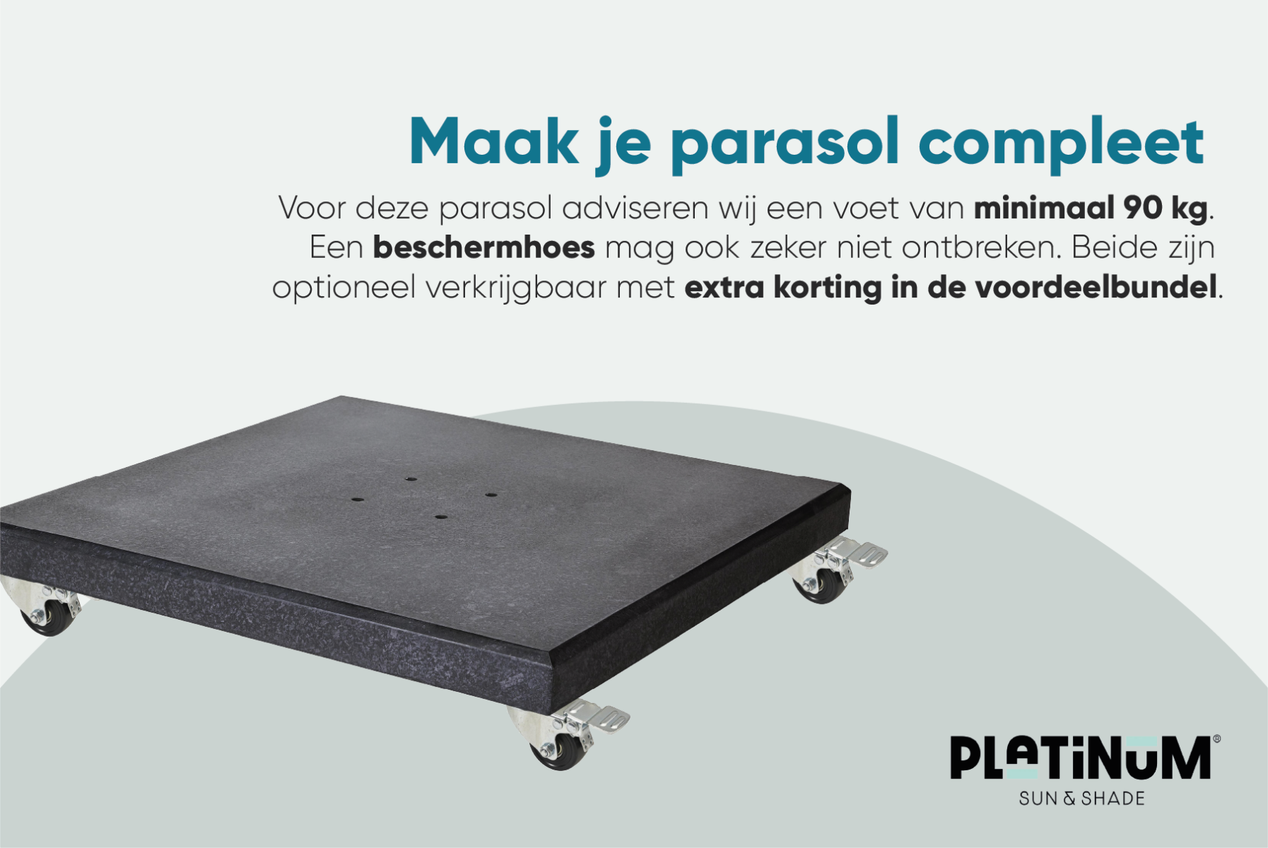 De Challenger T2 zweefparasol wordt standaard geleverd exclusief parasolvoet en parasolhoes. Wij raden u aan om gebruik te maken van een parasolvoet van minstens 90 kilogram. Deze hebben wij zowel met als zonder wielen. Ook is het mogelijk om te kiezen voor een ingraafparasolvoet. Deze heeft als voordeel dat je meer ruimte op je terras over hebt. Kortom genieten doe in de schaduw doe je met de Platinum Challenger T2 3x3 m. zweefparasol.