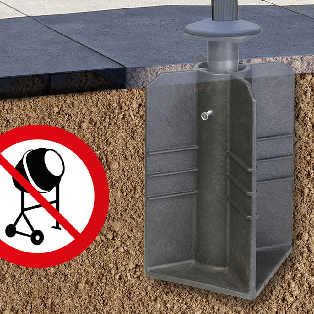 Instructies Platinum ingraafparasolvoet Deze ingraaf parasolvoet is alleen geschikt voor zweefparasols van maximaal L 300 x B 300 of Ø 350 cm groot. Het installeren is eenvoudig en je hebt geen beton nodig.