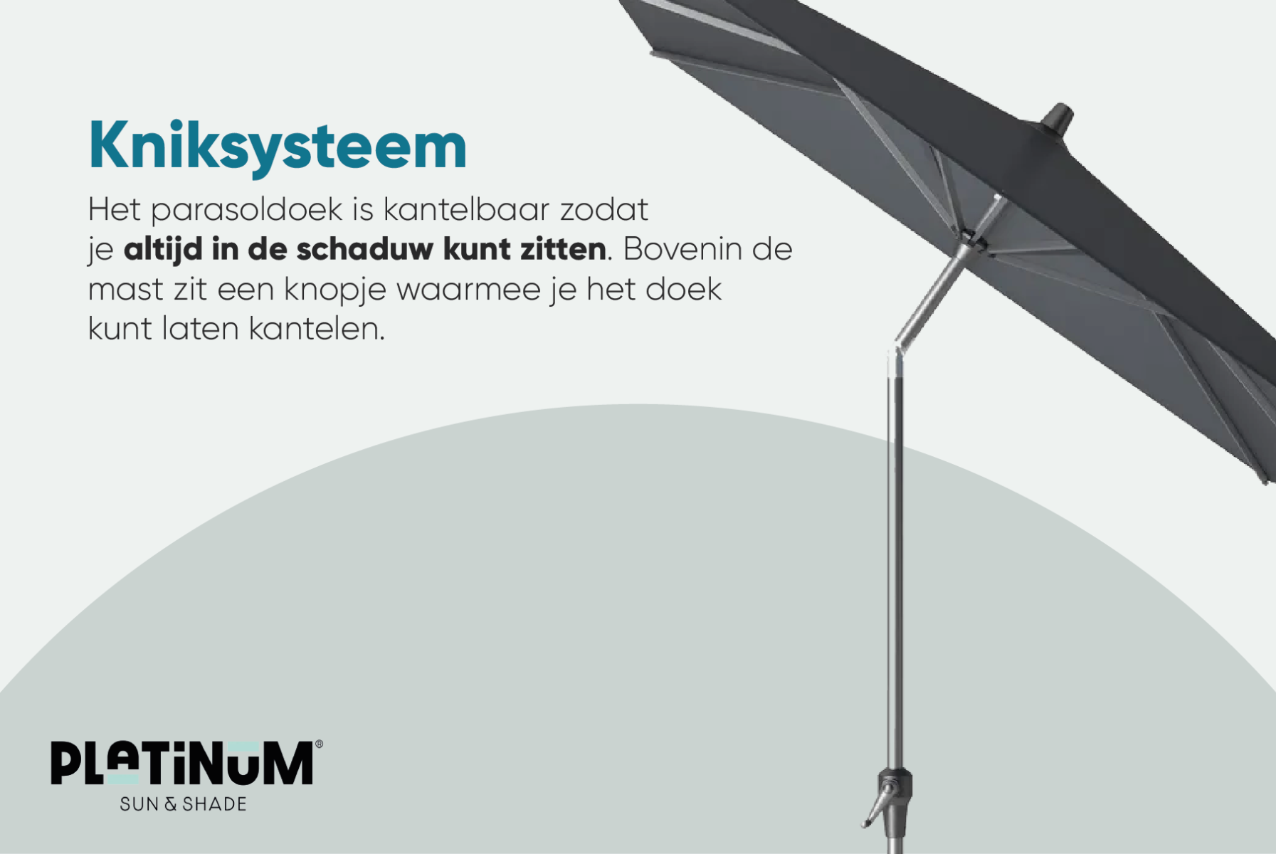 Met de Platinum Riva parasol kan je een heerlijke schaduwplek creëren. De Riva parasol is rond en heeft een doorsnede van 3 meter. Doormiddel van het handige opdraaimechanisme kan je de parasol eenvoudig in- en uitklappen. De mast van de Riva bestaat uit twee delen. Dit zorgt ervoor dat je de parasol uit elkaar kan halen en gemakkelijk kunt opbergen. Het parasoldoek van de Riva parasol 3 meter is Olive van kleur. Het doek is van goede kwaliteit, deze is namelijk gemaakt van 100% polyester. Daarnaast is het parasoldoek voorzien van een speciale vuil- en waterafstotende coating. Deze coating zorgt er ook voor dat het doek minder snel van kleur verschiet. Aan het uiteinde van de baleinen van de Riva parasol is een speciale doekspanner gemaakt. Hierdoor staat het doek altijd mooi strak gespannen. De Riva parasol is voorzien van een handig kniksysteem. Hiermee kan je goed inspelen op de stand van de zon. Je kantelt het parasoldoek daarmee namelijk eenvoudig schuin in de baan van de zon. De parasol vangt in de schuine stand wel meer wind. Wij adviseren dan ook om daar goed het oog in te houden.