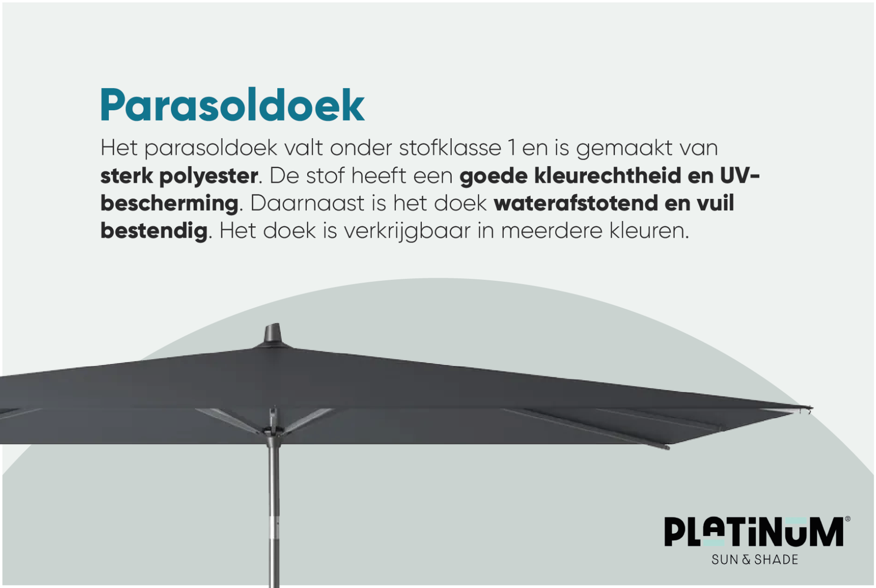 Functionaliteit, design, gebruiksgemak en robuustheid staan centraal bij alle producten van Platinum. Platinum levert parasols in allerlei soorten en maten: van compacte strandparasol tot royale zweefparasol. Dankzij de uitstekende kwaliteit materialen staan de producten van Platinum garant voor jarenlang gebruiksplezier!