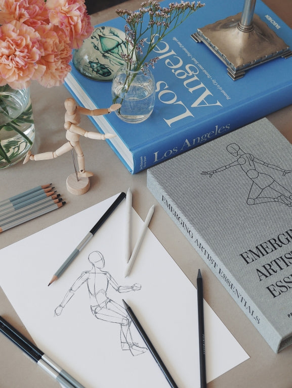 - Bevat 1 mannequin, 2 puntenslijpers, 2 gummen, 2 kleurpotloden, 3 pastel potloden, 3 houtskoolpotloden, 2 grafietpotloden en 10 schetspotloden.