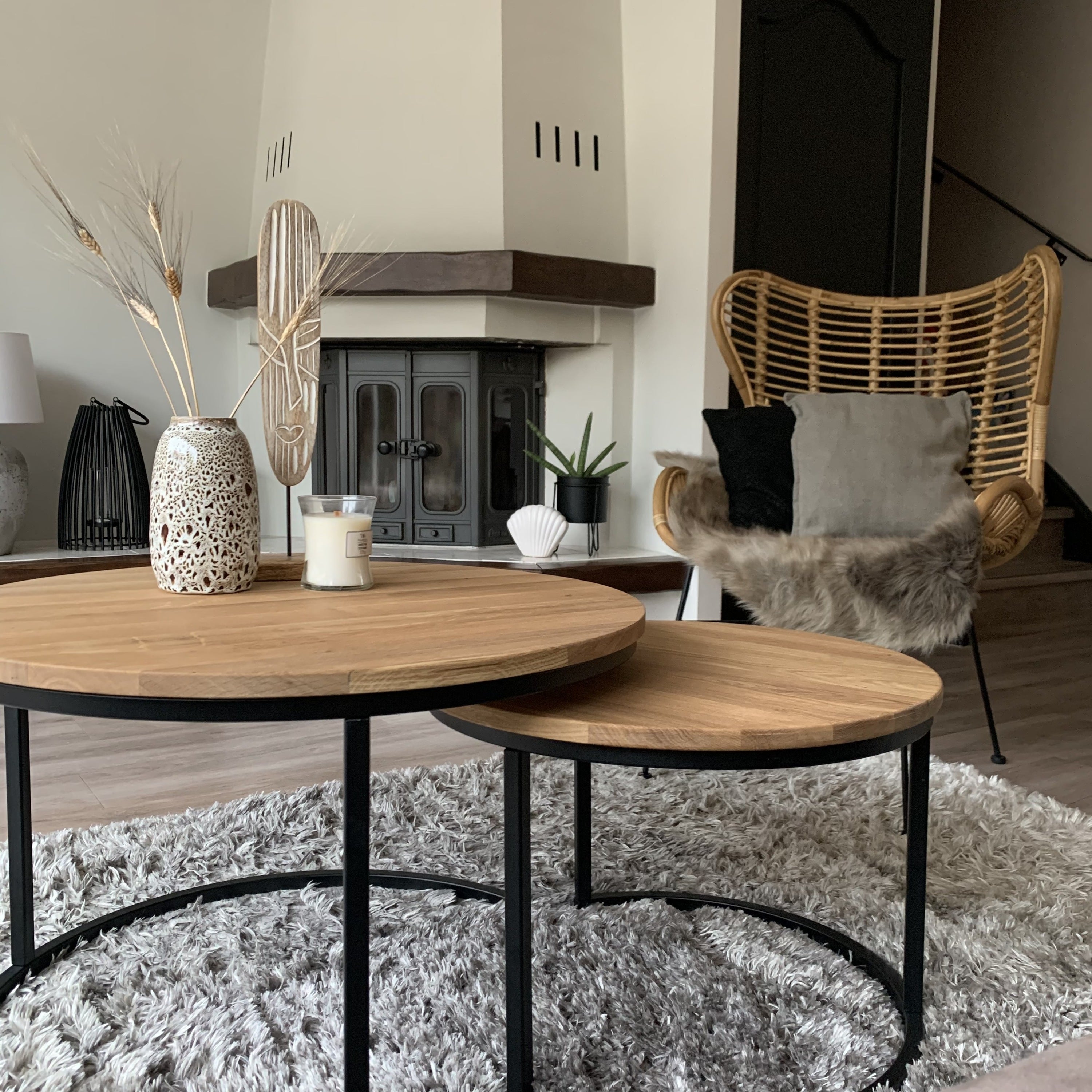 De grote tafel heeft een diameter van 58 centimeter en is 47 centimeter hoog zodat je makkelijk bij je kopje thee of tijdschrift kunt. De kleine salontafel heeft een diameter van 45 centimeter en is 40 centimeter hoog. Dus heb je een wat kleinere woonkamer en is de visite naar huis? Dan schuif je je kleine salontafel makkelijk weer onder de grote tafel. Waarom worden wij blij van onze ronde eiken fineer Kiev salontafels? - Robuuste uitstraling door de combinatie van hout en staal - Onderhoudsarm rustiek eiken fineer - Ook geschikt voor de kleinere ruimtes - De rustieke structuur van het hout is zichtbaar - Ideale hoogte van 47 cm