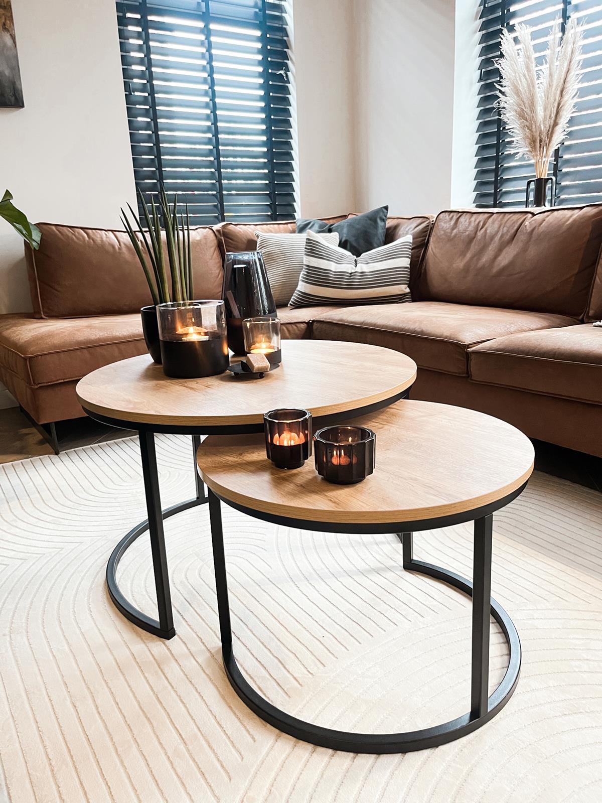 Toe aan een nieuwe look in je interieur? Dan is onze salontafel set Kiev perfect! Het robuuste zwarte onderstel in combinatie met de rustieke eikenhouten fineer bladen geeft jouw interieur al snel die warme Scandinavische uitstraling. Dankzij de natuurlijke houtkleur van het rustiek eiken fineer is de set makkelijk te combineren en nog makkelijker te decoreren. Een paar mooie planten en kaarsen erop en met weinig inspanning heb je een hele nieuwe look in je woonkamer!