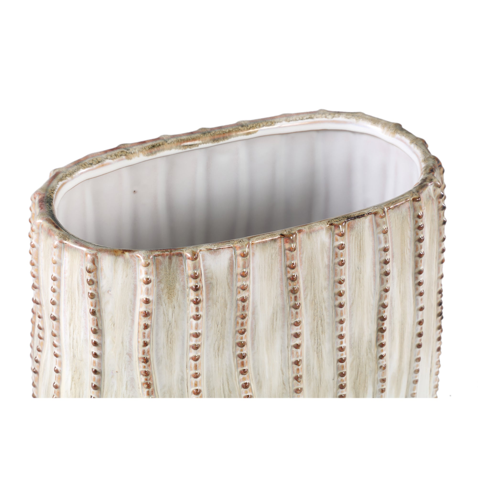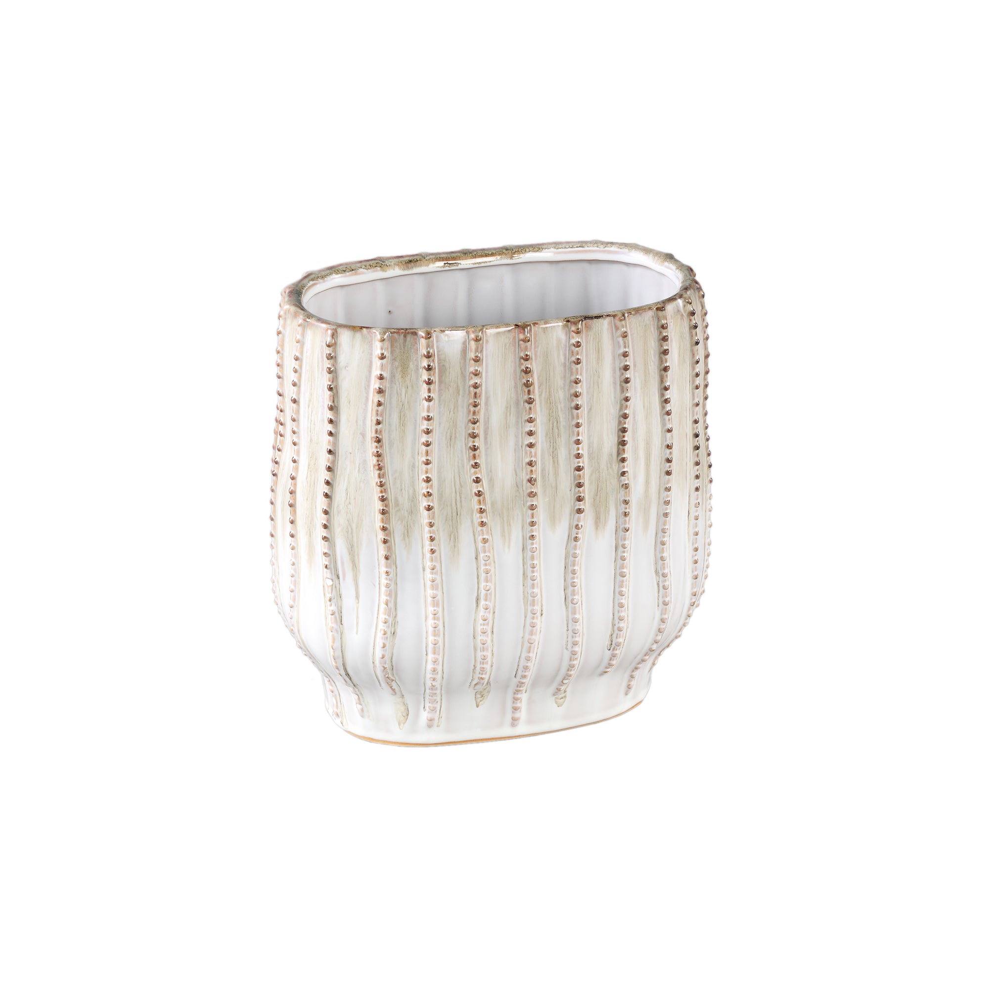 Voeg een vleugje elegantie toe aan je interieur met de PTMD Dell Cream keramieken geglazuurde pot met lijnpatroon
