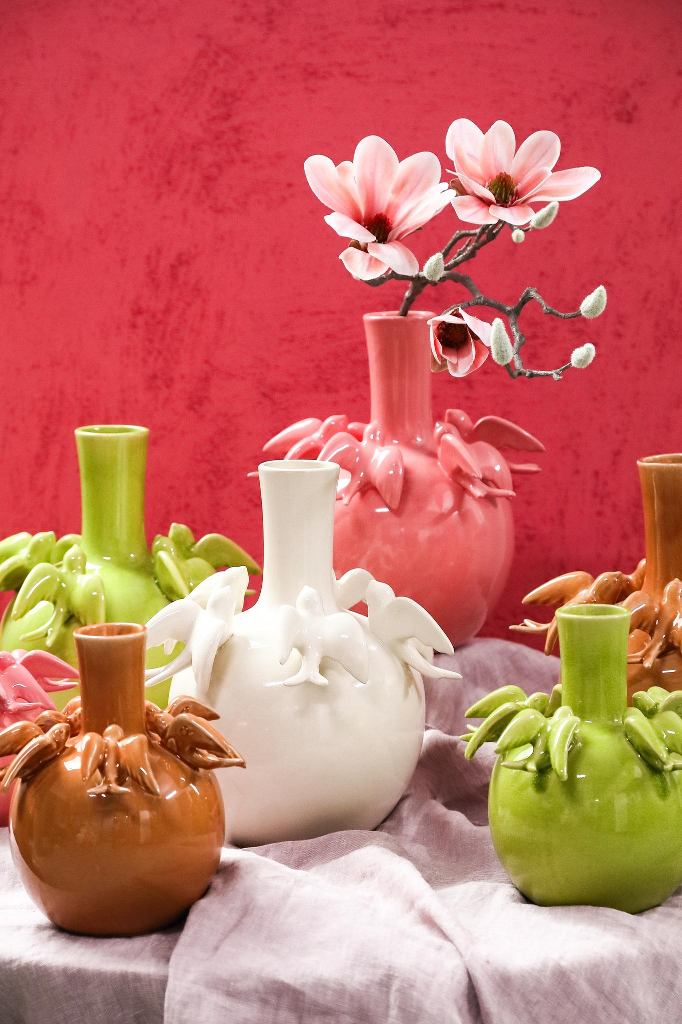 Het vogelmotief op de vaas voegt een speelse, natuurlijke uitstraling toe, die in combinatie met de subtiele roze kleur zorgt voor een verfijnd en kunstzinnig effect. Dit maakt de vaas niet alleen functioneel, maar ook een prachtig decoratief object.