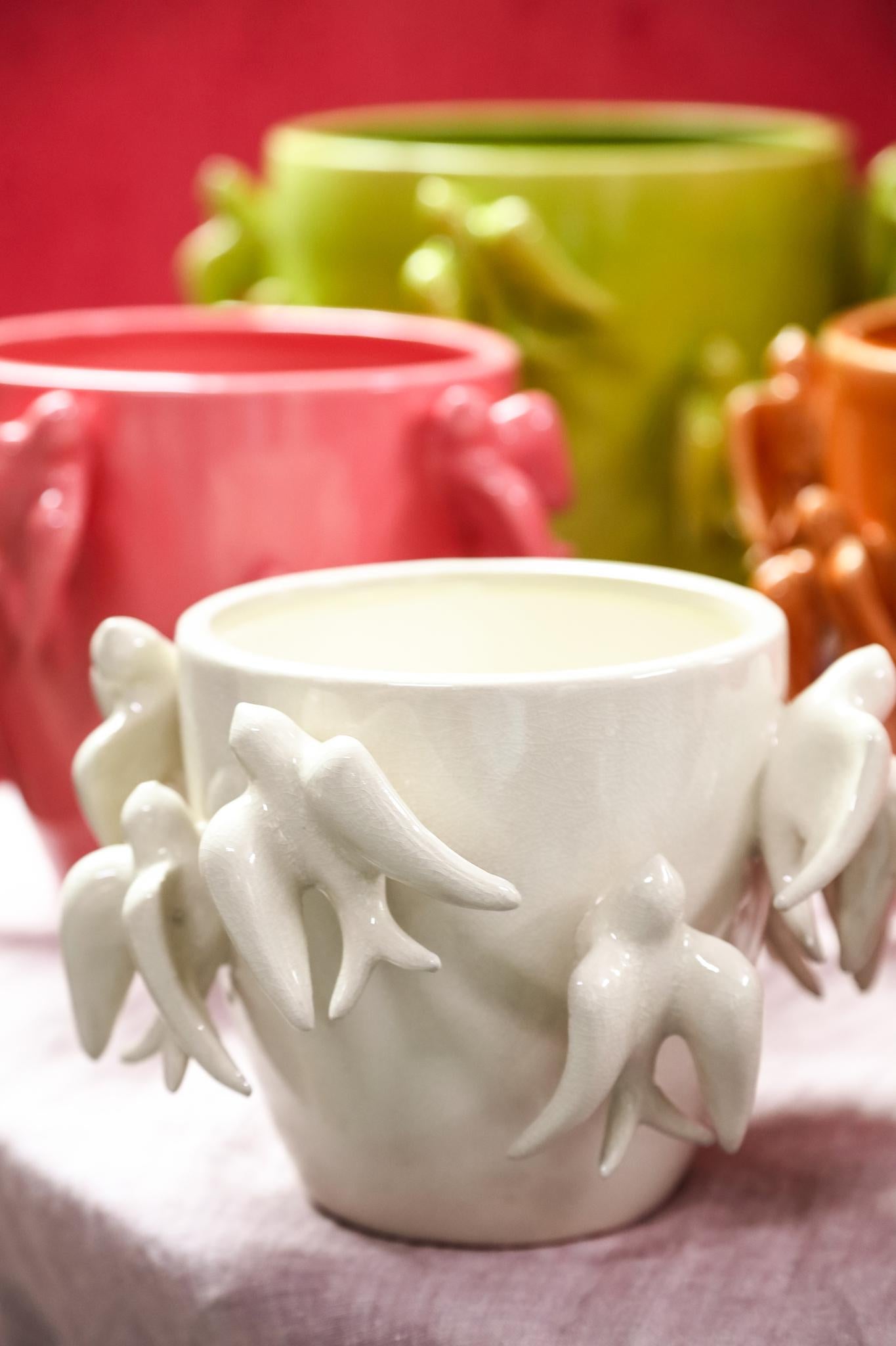 De subtiele vogelfiguren op de rand van de pot geven een speels en natuurlijk karakter aan het ontwerp. Dit maakt de pot niet alleen functioneel, maar ook een charmant decoratief item.