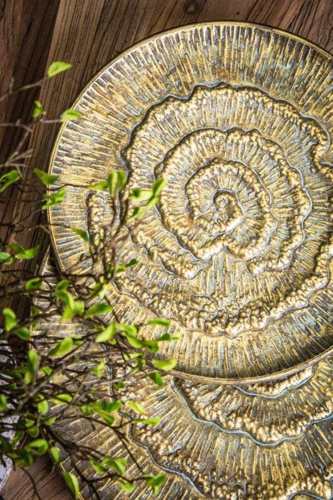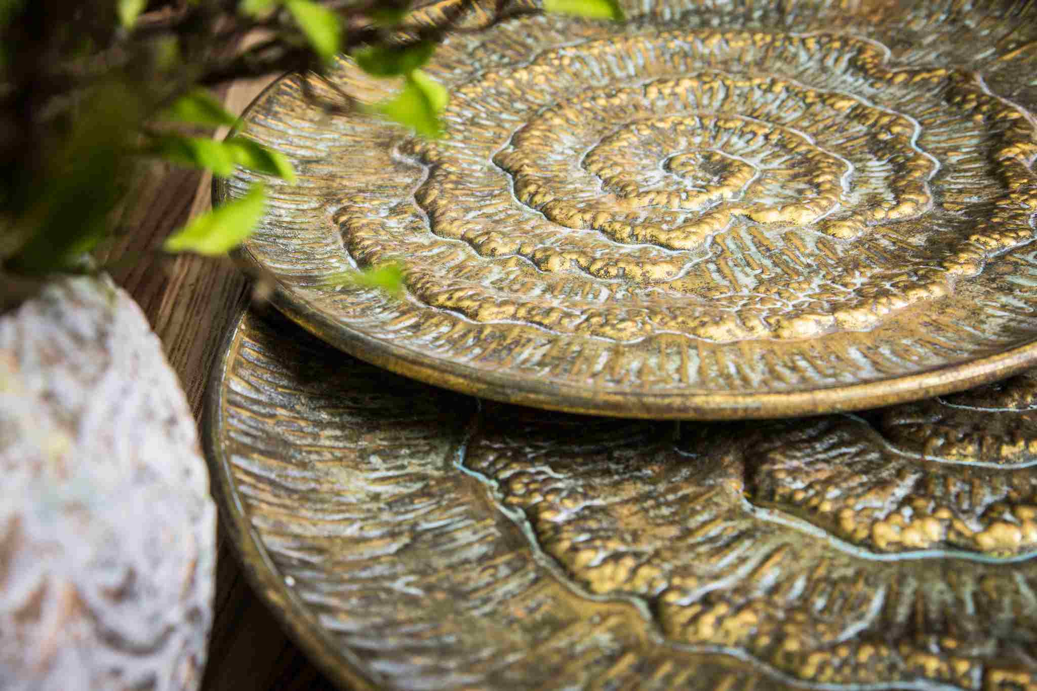 Deze set van 2 schalen zijn van metaal en staan op een kleine verhoging. Mooi om die plant, vaas bloemen of kaarsen op te zetten.De afmetingen van de set van 2 is: S: 39 x 39 x 3,5 cm L: 51,5 x 51,5 x 4 cm