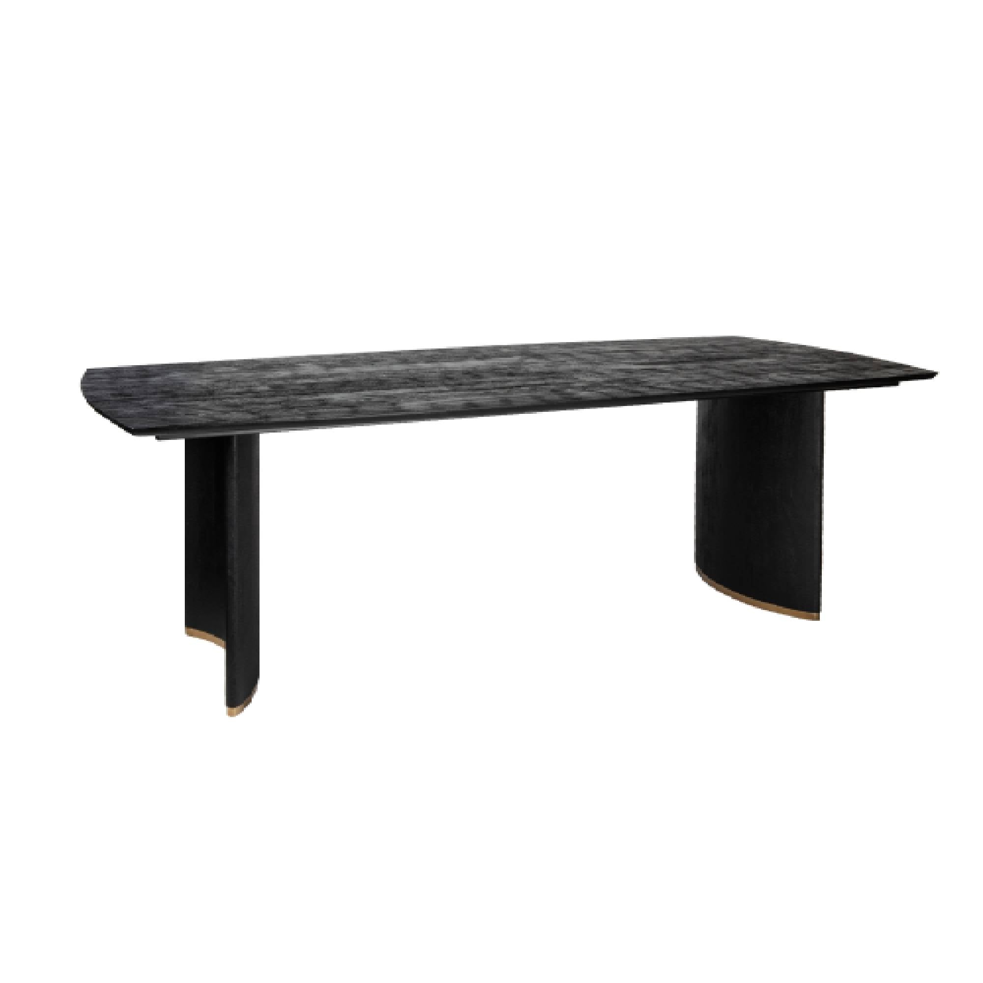 Elegant design: Het tafelblad van mangohout in diep zwart wordt ondersteund door een slank gouden onderstel, wat zorgt voor een tijdloze en elegante uitstraling in je eetkamer.