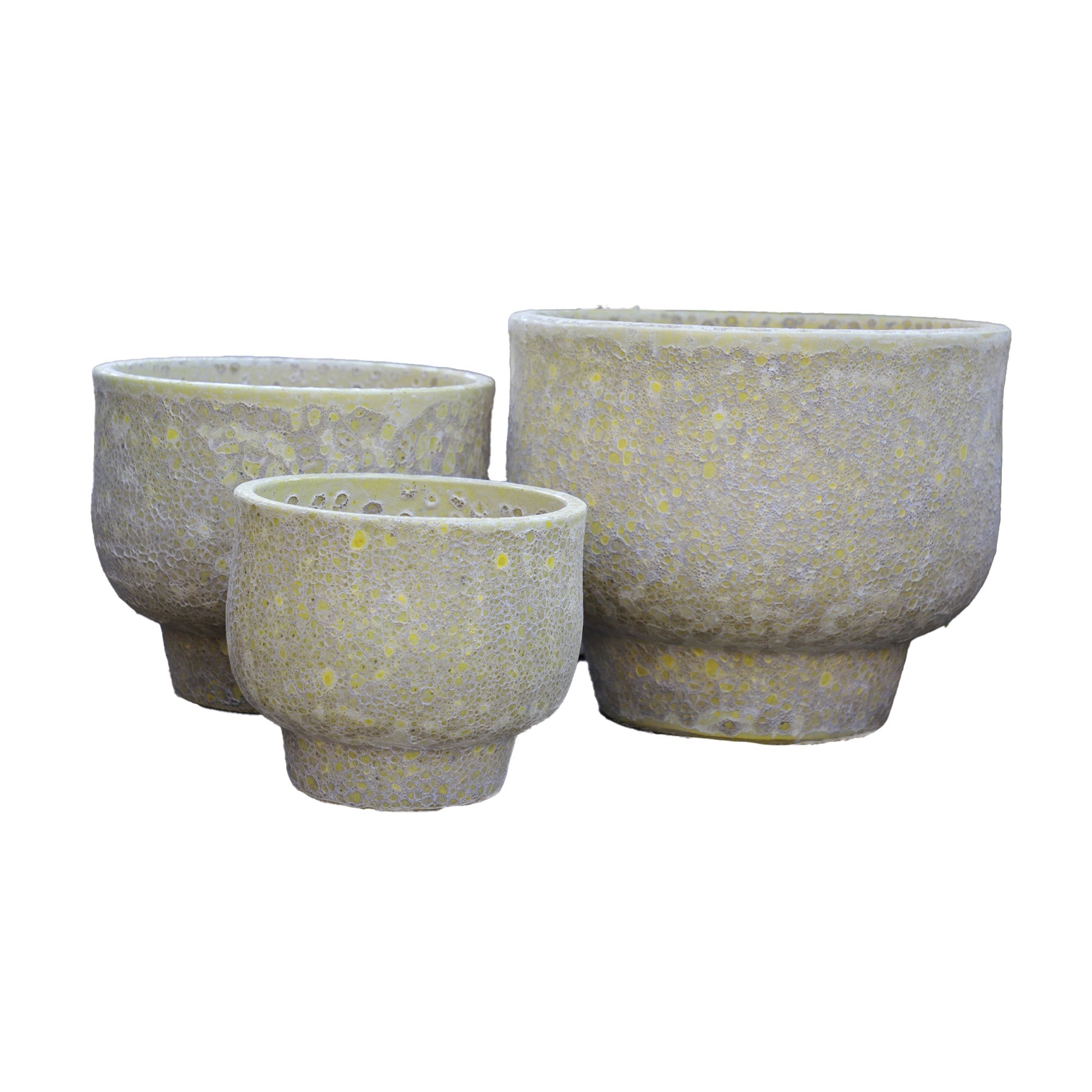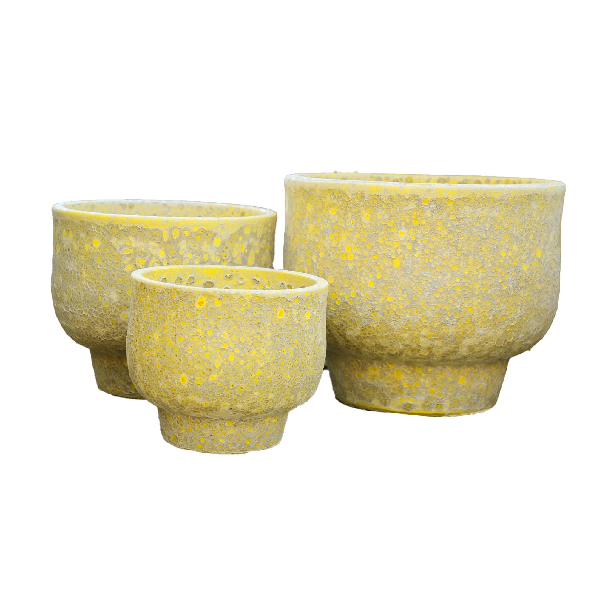 De PTMD Sanish Yellow Glazed Ceramic Pot Rough On Foot SV3 heeft een opvallende, handgemaakte uitstraling. De combinatie van de warme gele glazuurlaag en de ruwe afwerking geeft de pot een speelse en artistieke look.