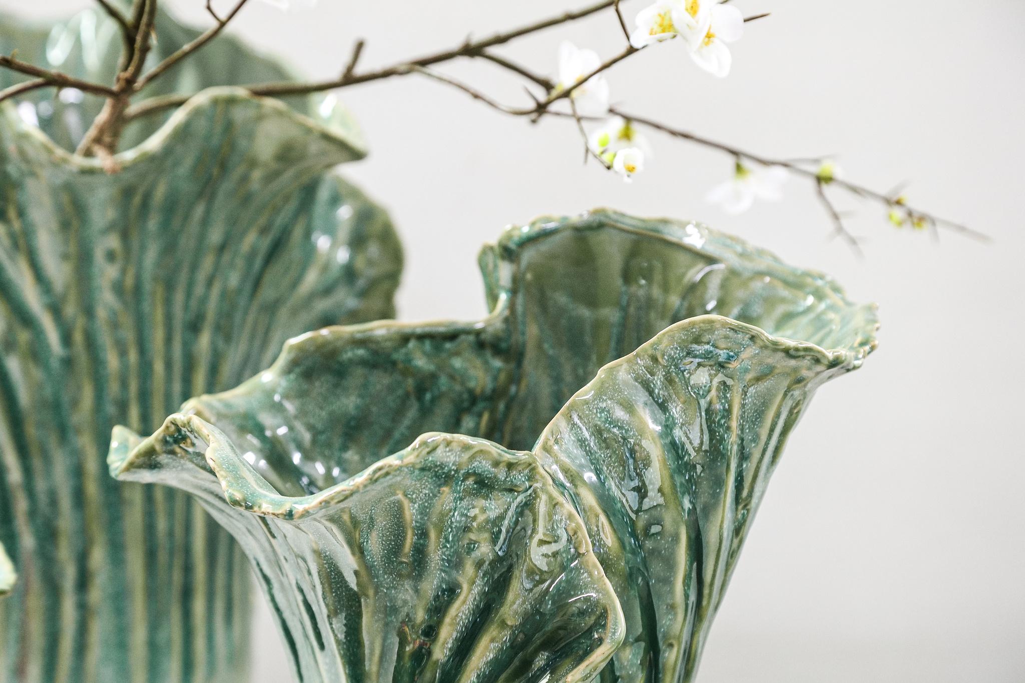 Het PTMD Swing Green Ceramic Pot Cabbage Shape L heeft een ontwerp dat geïnspireerd is op de natuurlijke vormen van koolbladeren. Dit zorgt voor een speelse en organische uitstraling die perfect past bij een bohemian of eclectisch interieur.