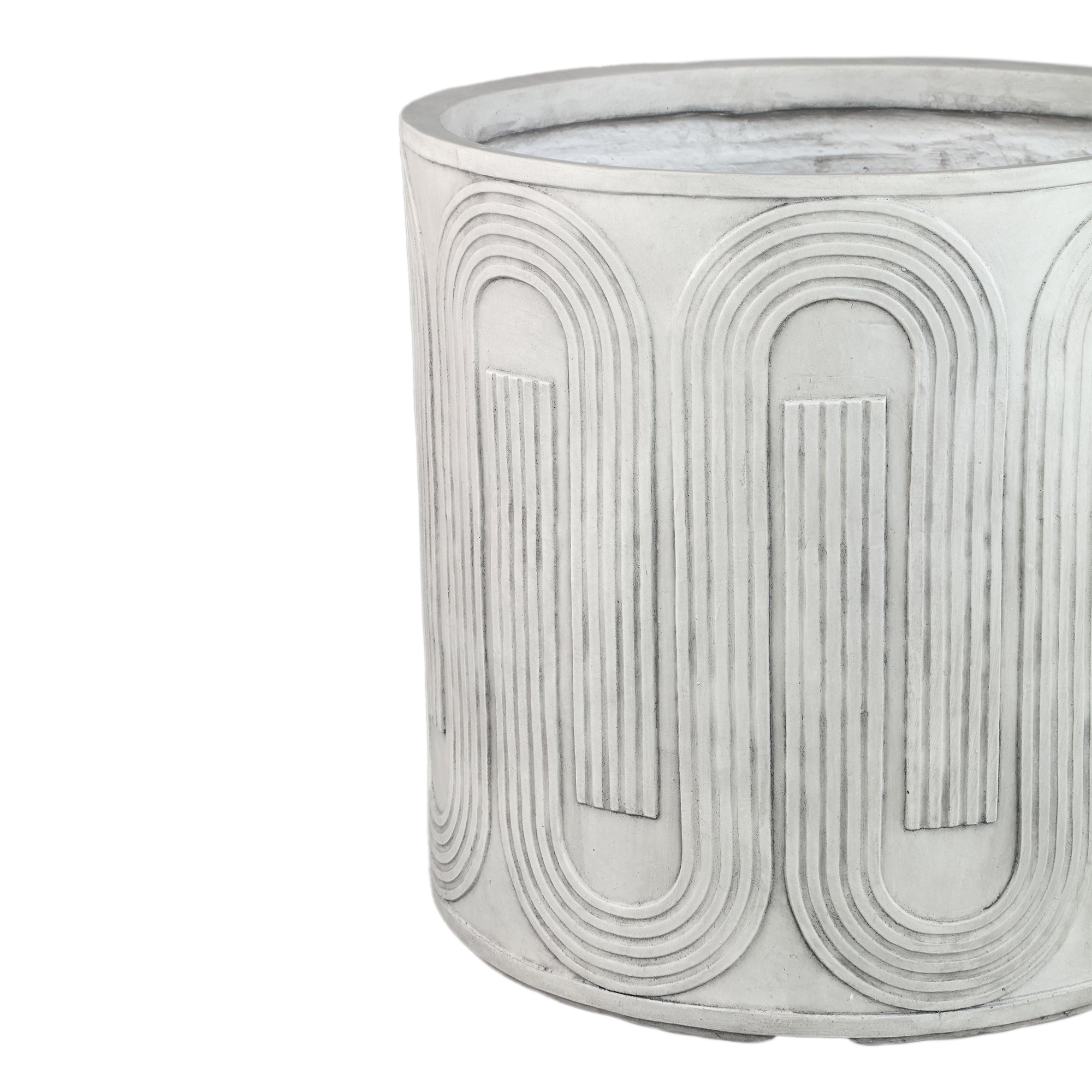 De PTMD Zakerie White Round Magnesium Pot Wavy Pattern SV4 heeft een prachtig golvend patroon dat een speelse, maar toch verfijnde uitstraling geeft. Het subtiele ontwerp voegt een artistiek element toe aan elke ruimte of tuin.