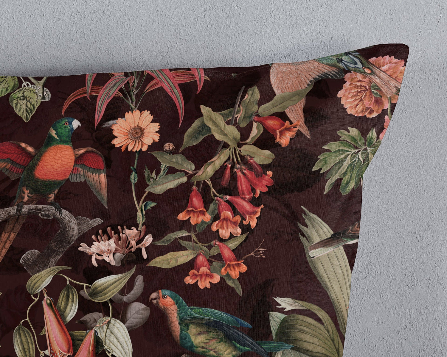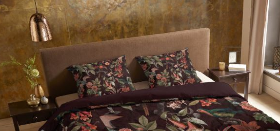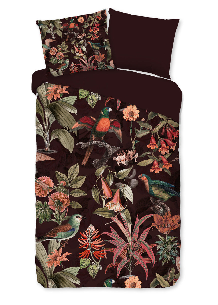 Dekbedovertrek Elmira van Pure heeft een sfeervolle jungleprint met weelderige bladeren en vogels op een diepzwarte achtergrond. De rijke bordeauxrode kleuren van het dessin komen prachtig tot hun recht tegen het donkere vlak en geven je slaapkamer een stijlvolle, mysterieuze uitstraling met een vleugje tropische luxe.