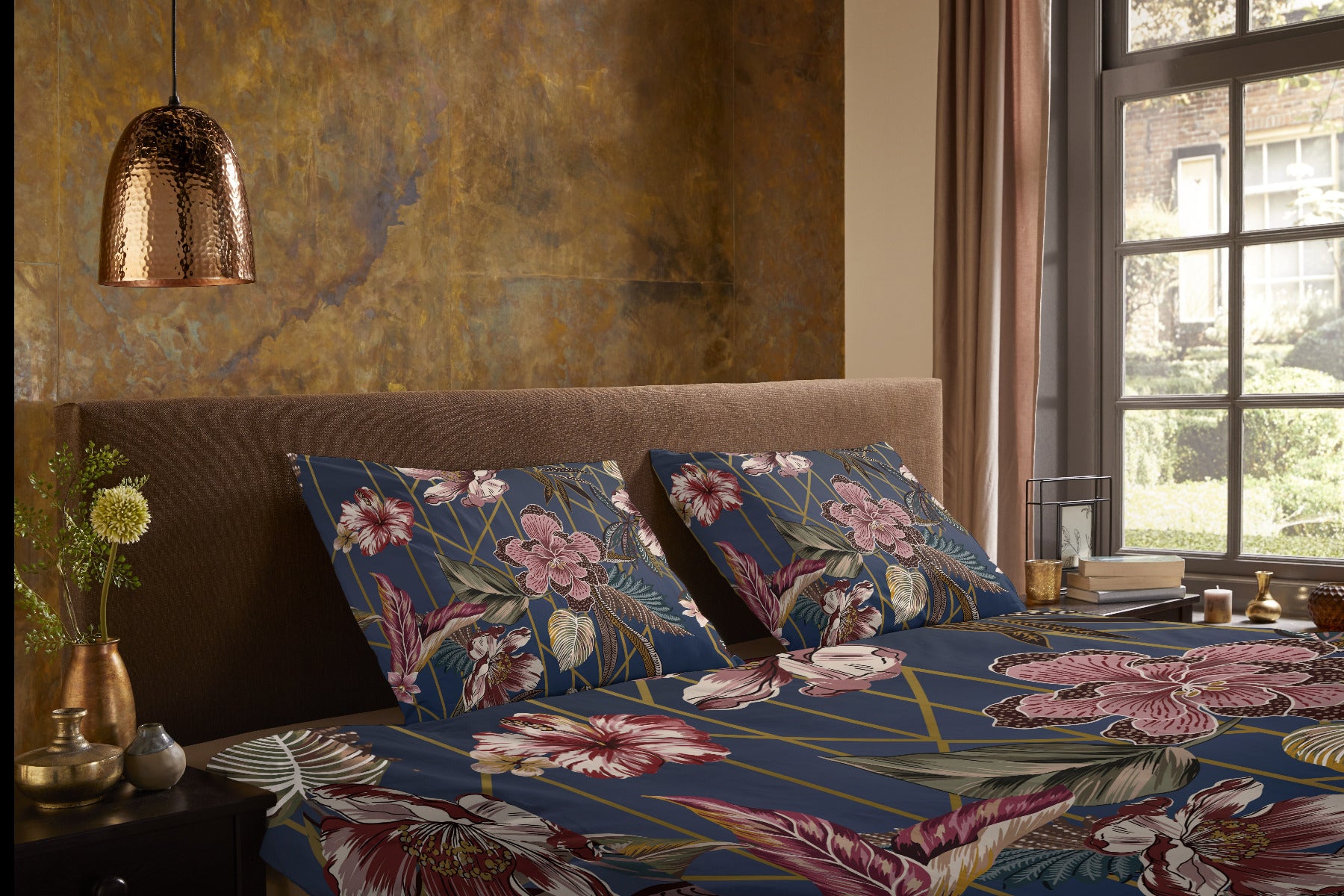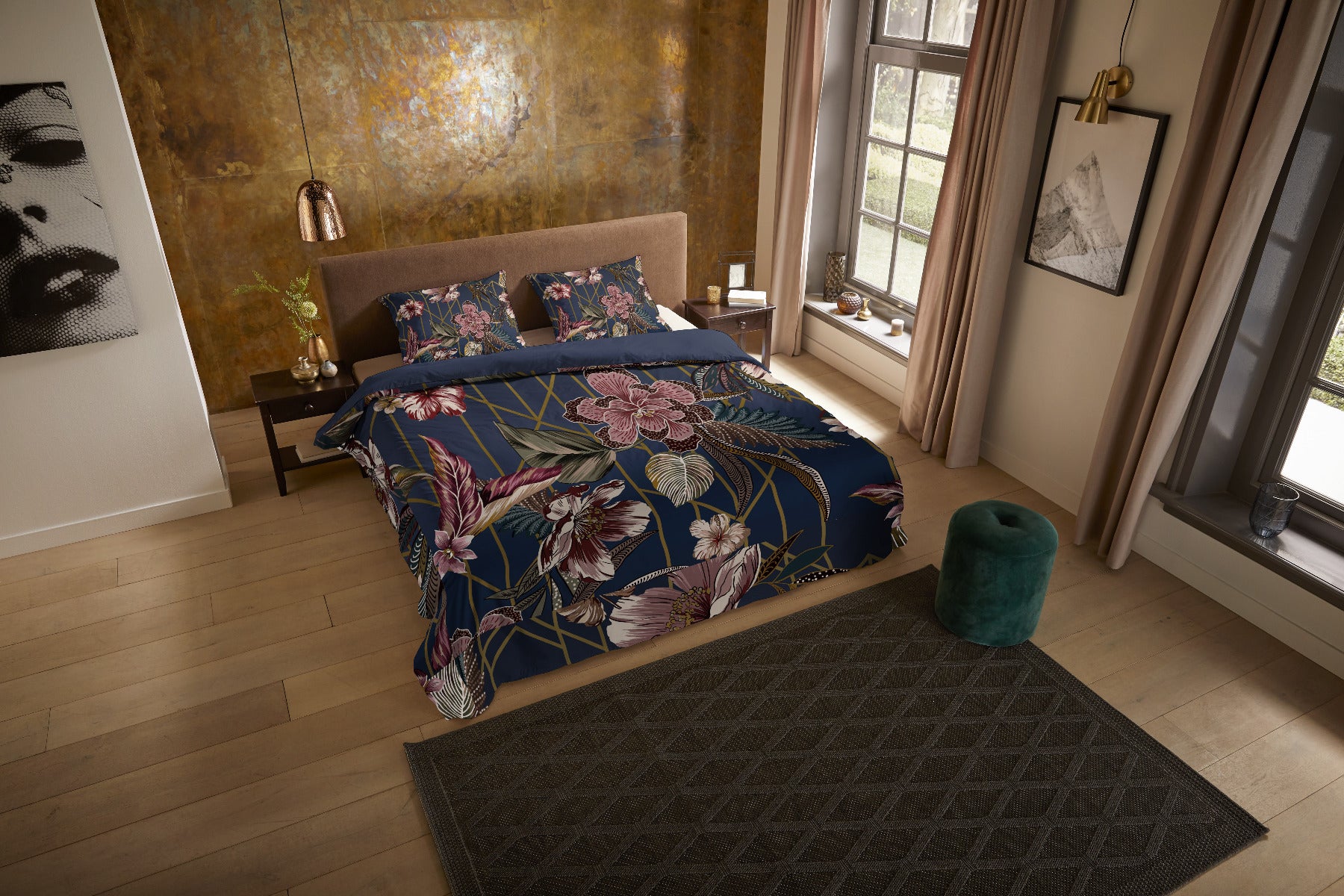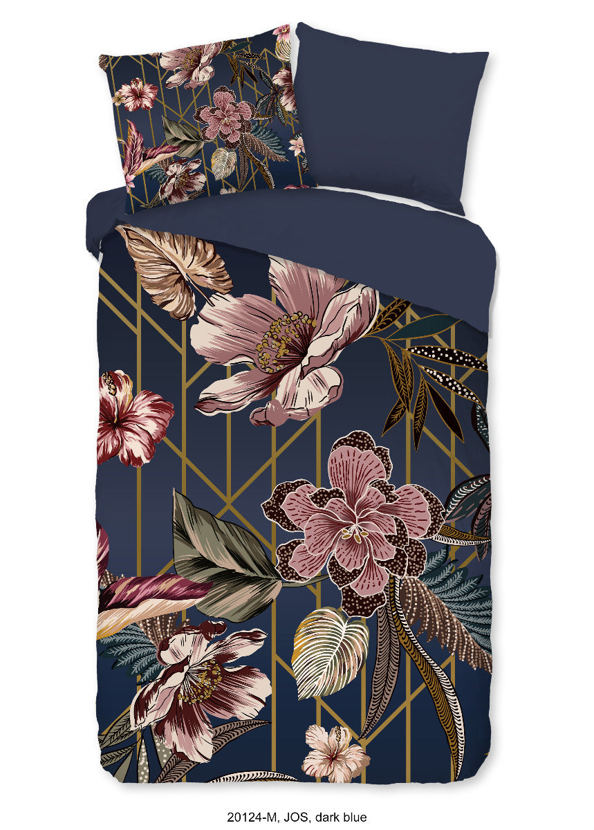 Dekbedovertrek Jos van Pure heeft een opvallend dessin met schitterende grote bloemen en geometrische elementen in goud. De diepe donkerblauwe tint zorgt voor een sfeervolle, elegante uitstraling in de slaapkamer, terwijl het patroon zorgt voor een eigentijdse twist.