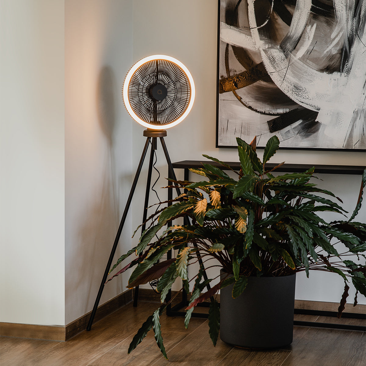 QAZQA Vloerventilator tripod zwart incl. LED 3-staps dimbaar - Meric