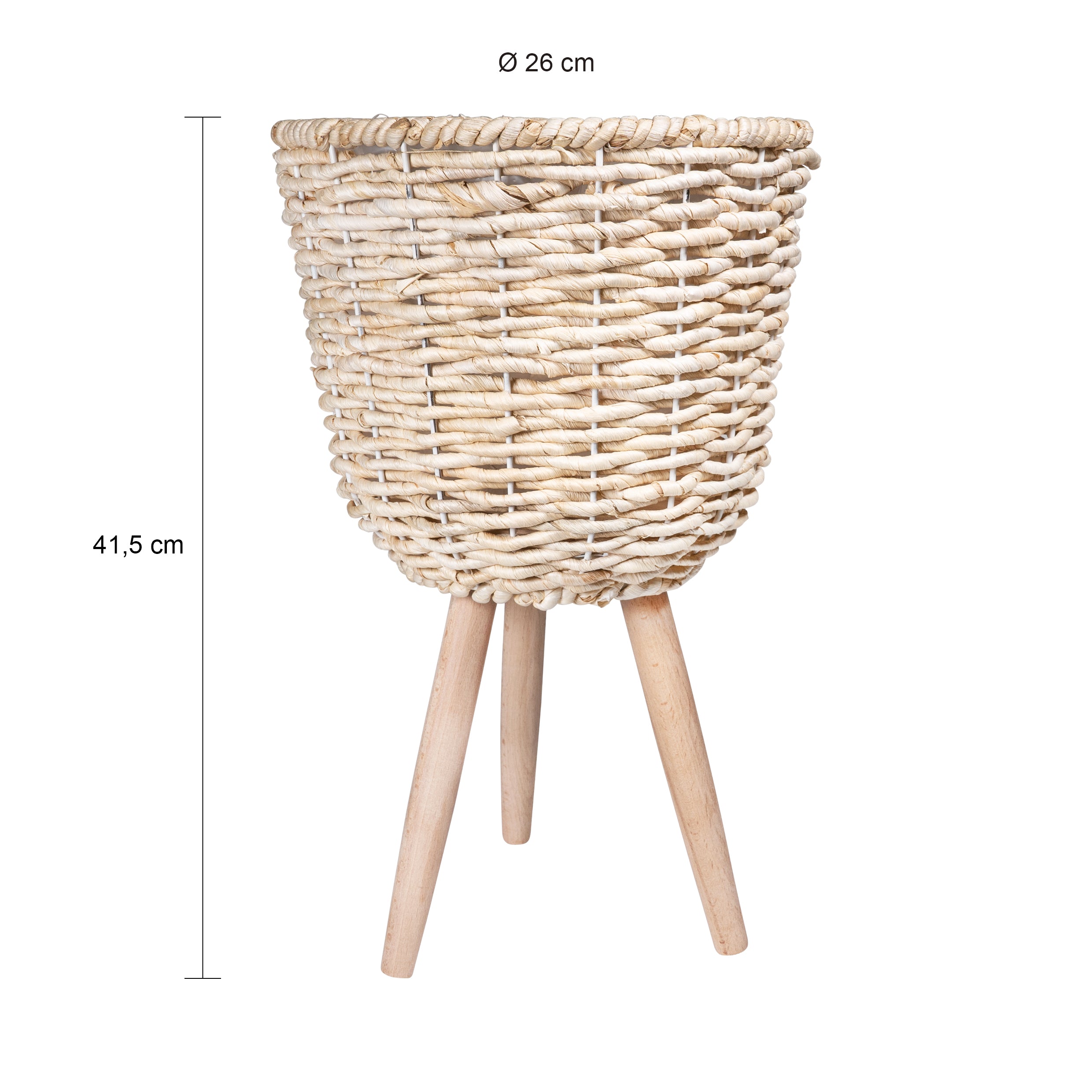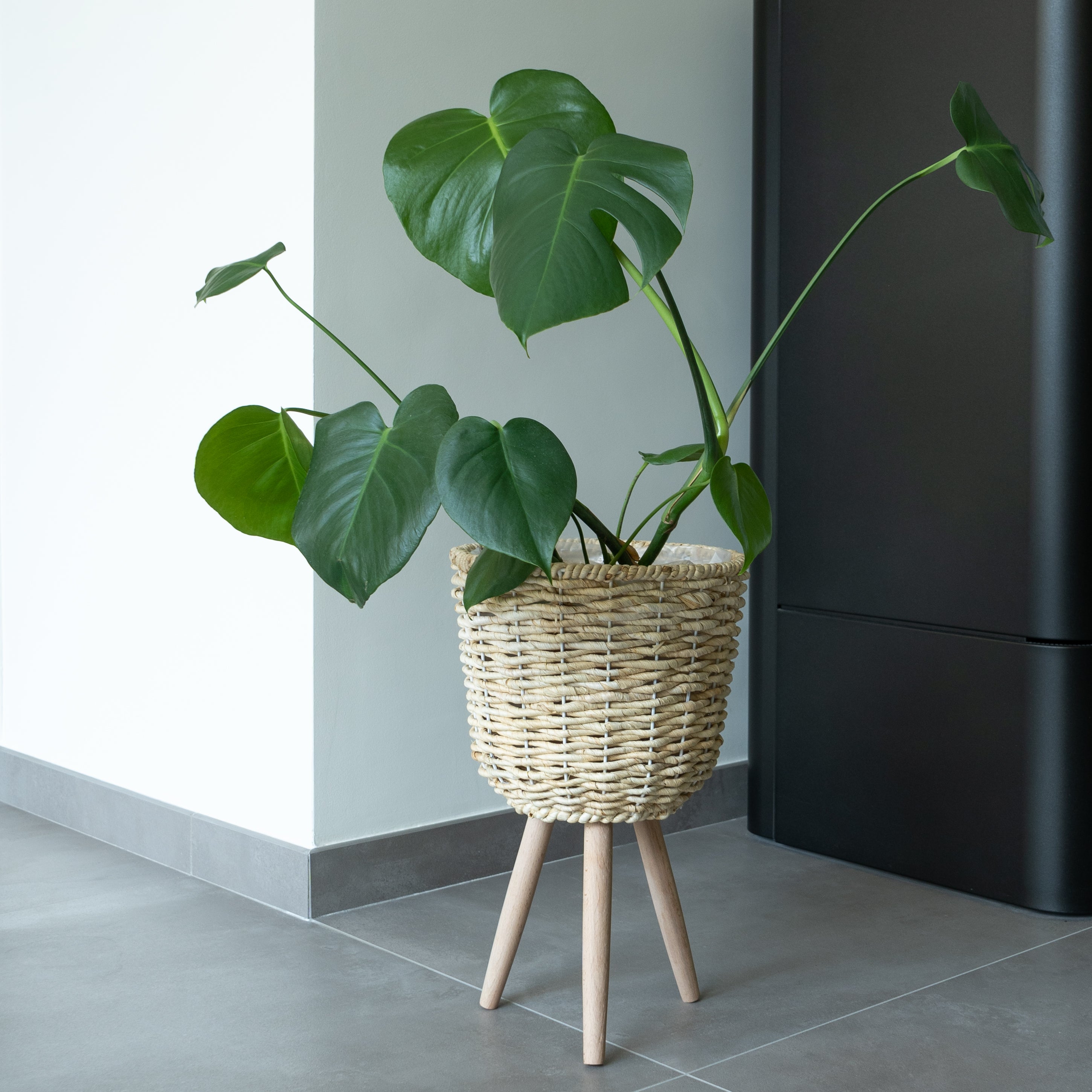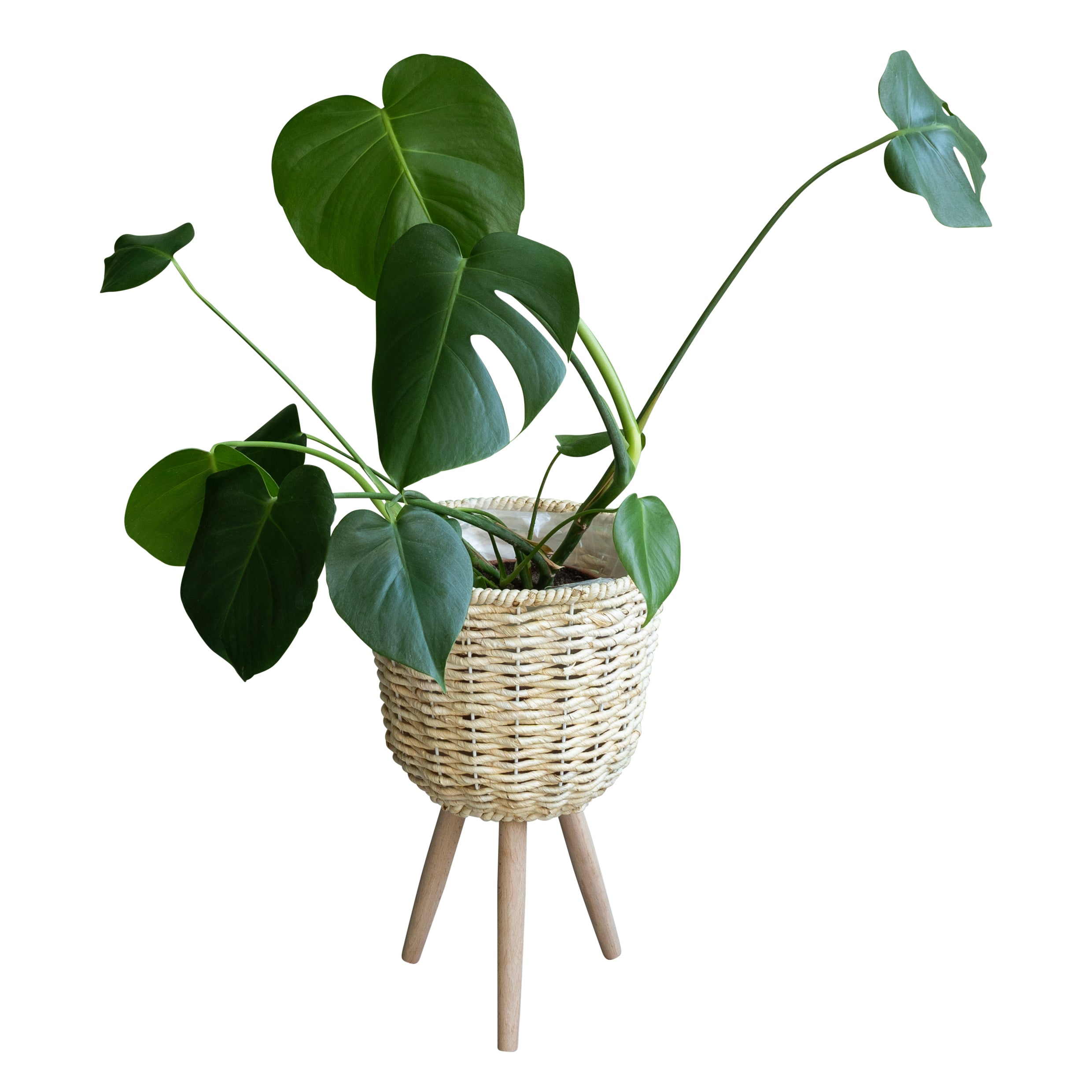 - Deze QUVIO Plantenmand op driepoot is gemaakt van raffia en hout.