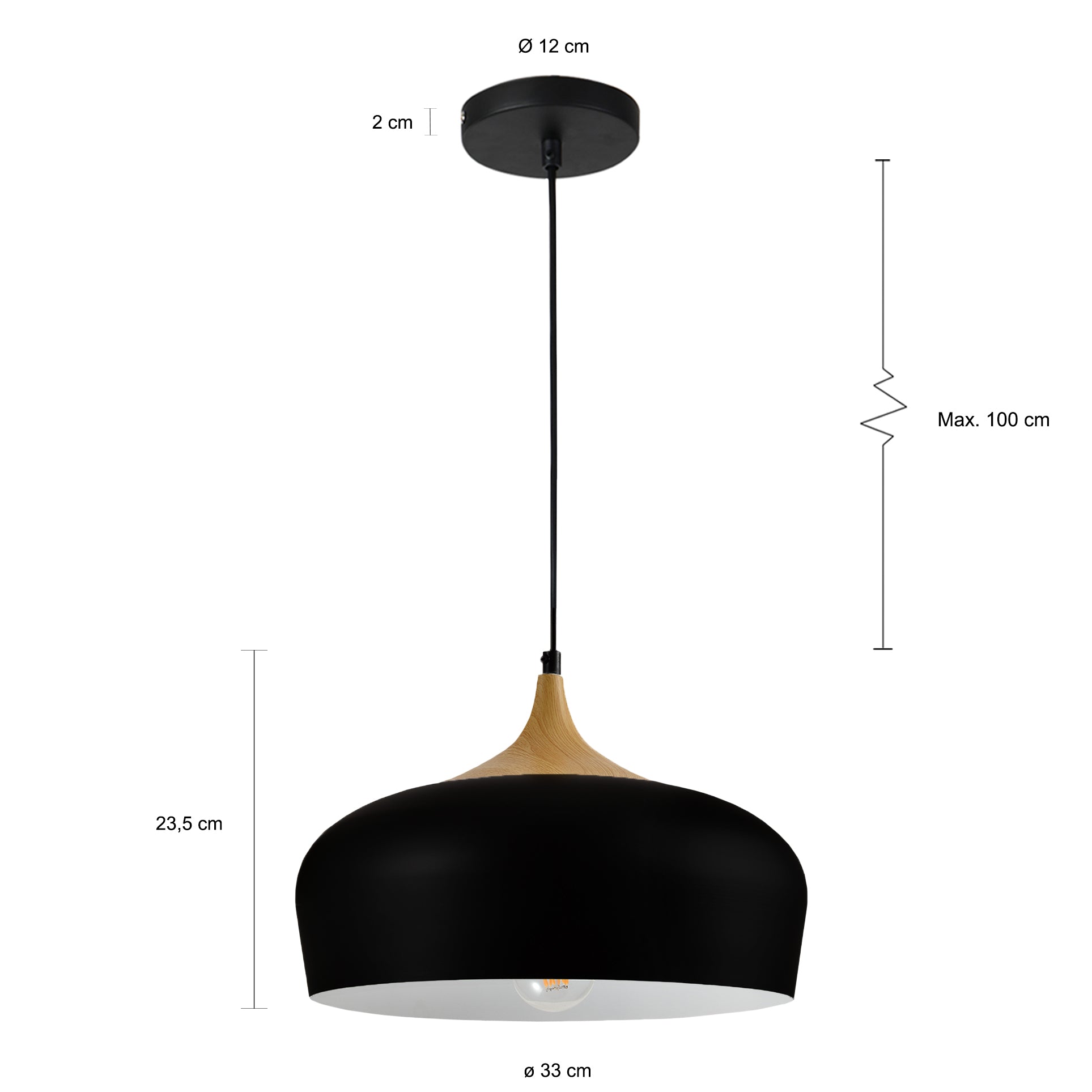 - De afmeting van de kap is 33 x 33 x 23,5 cm (lxbxh). De maximale snoerlengte is 100 cm en kan ingekort worden. De lamp bevat een E27 fitting.