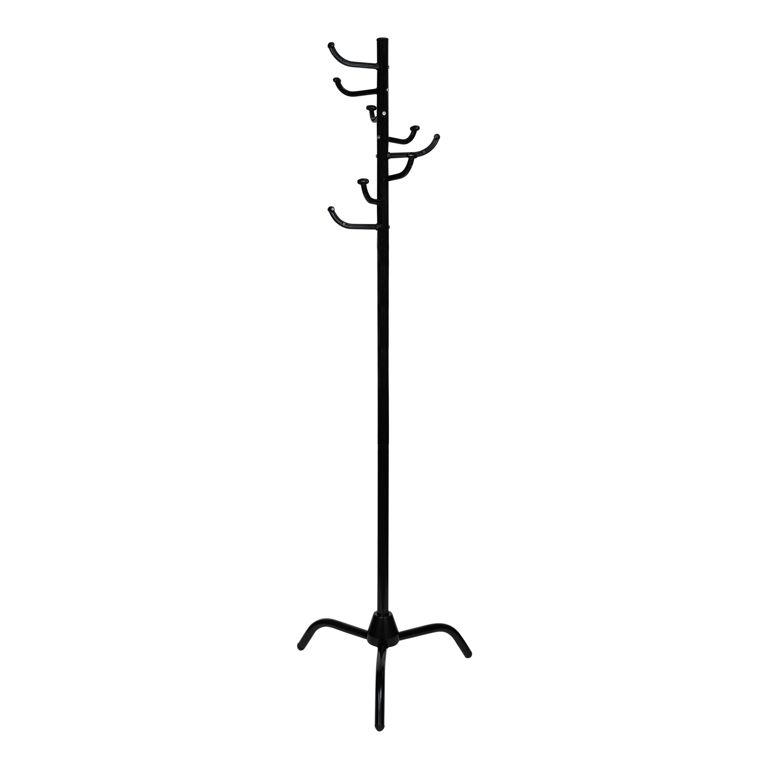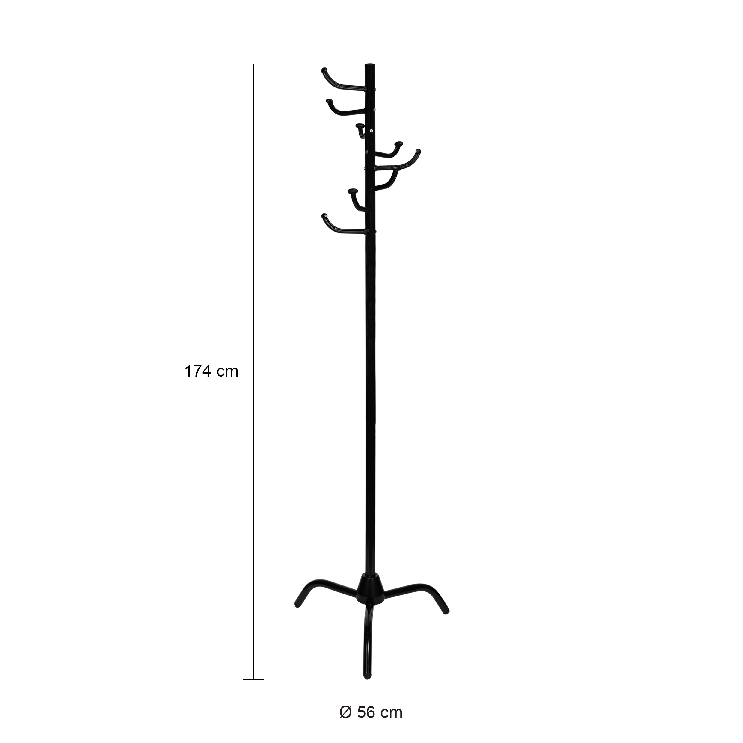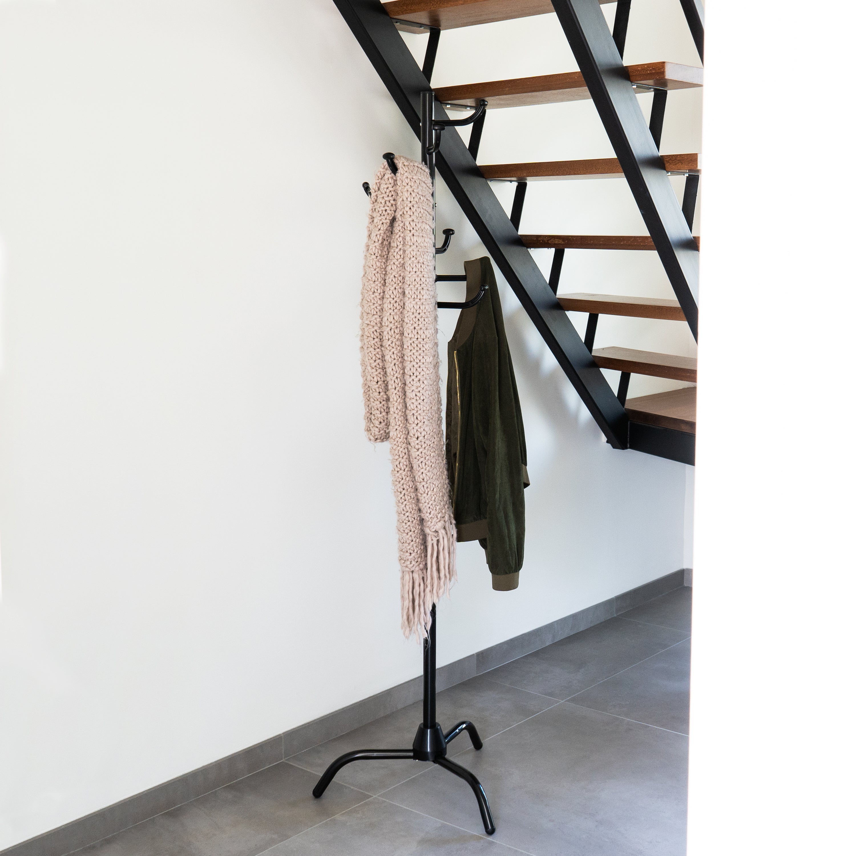 - De staande kapstok heeft drie poten aan verschillende zijde, waardoor hij stevig op de grond staat.