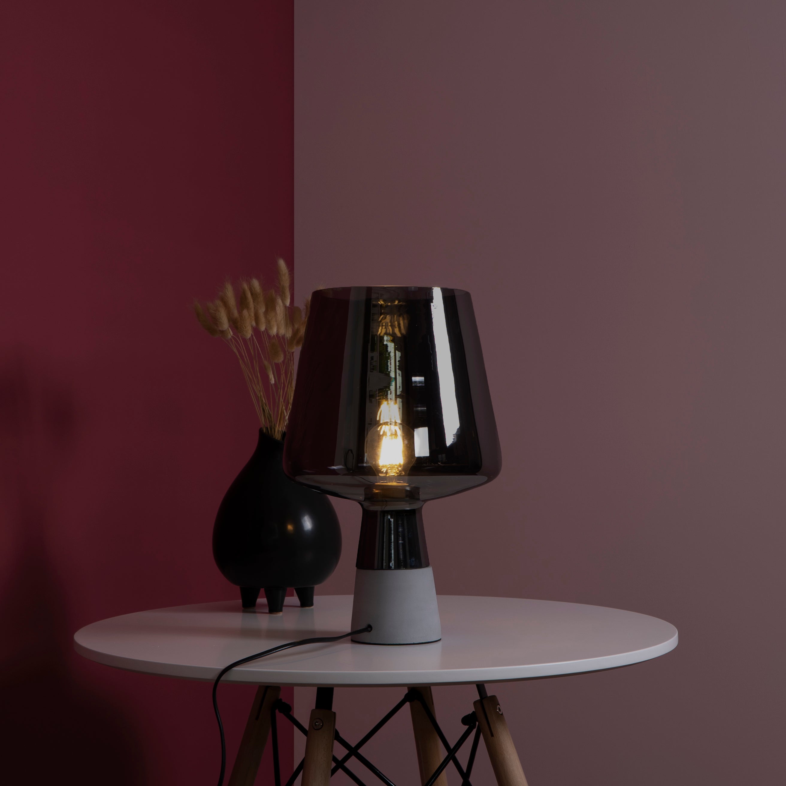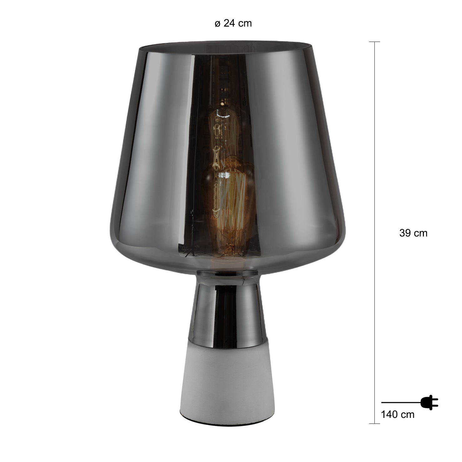 - Dankzij het gerookte glas straalt deze lamp een diffuus licht uit.