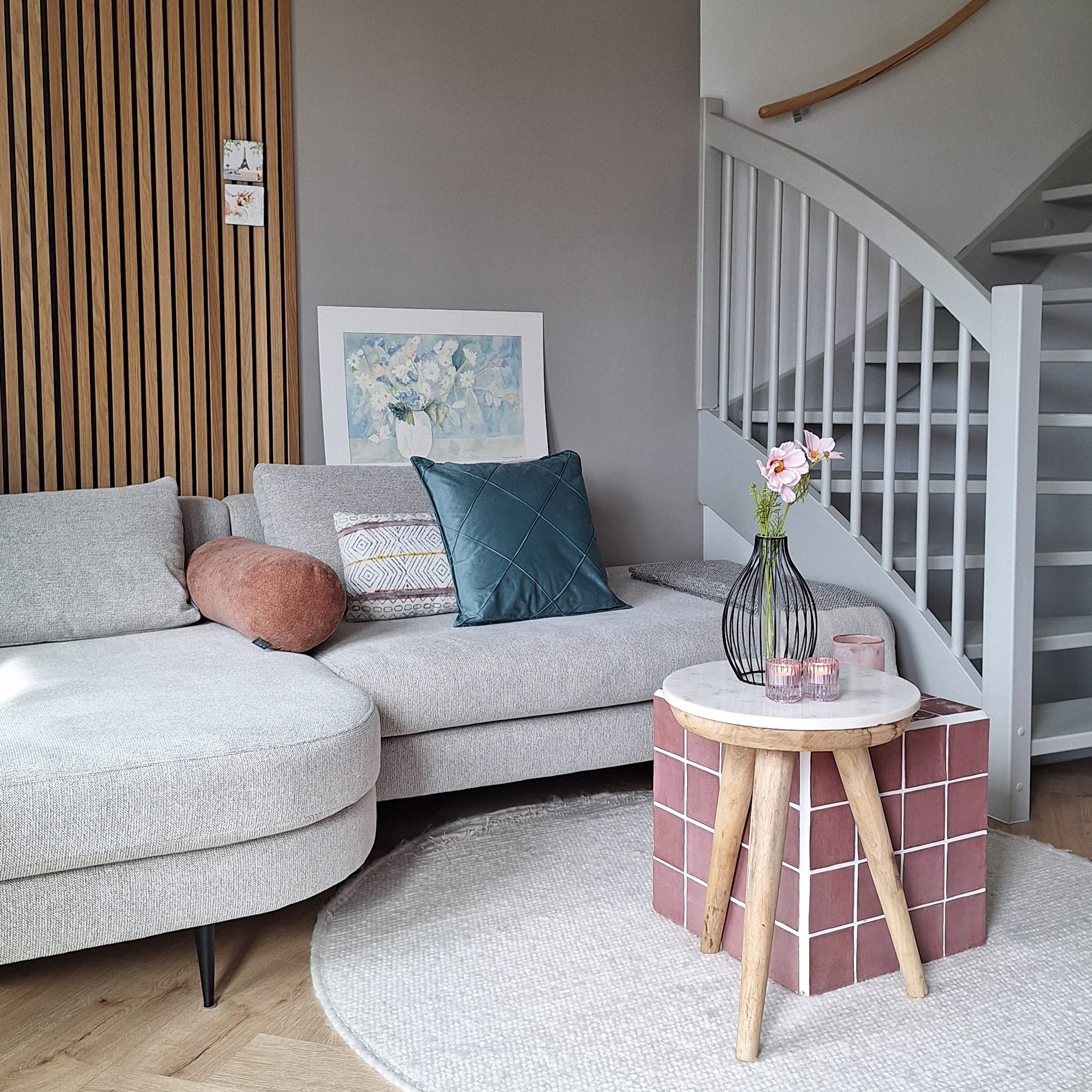 Bloemen brengen vrolijkheid en gezelligheid in huis. Het voelt echt als lente wanneer je voor het eerst weer een bosje bloemen in huis haalt. Dit vaasje met metalen spijlen in combinatie met vrolijke bloemen, levert een interessant contrast op.