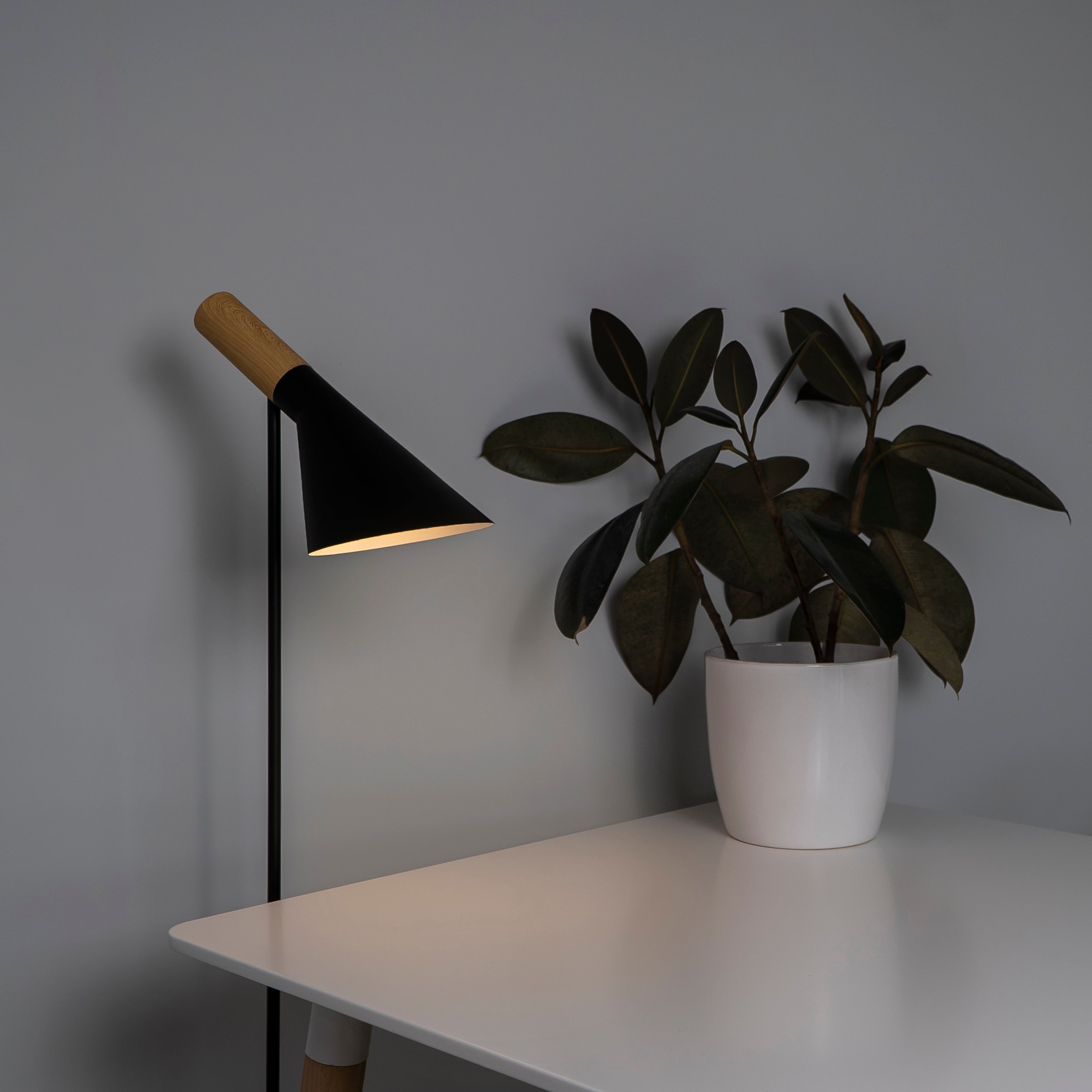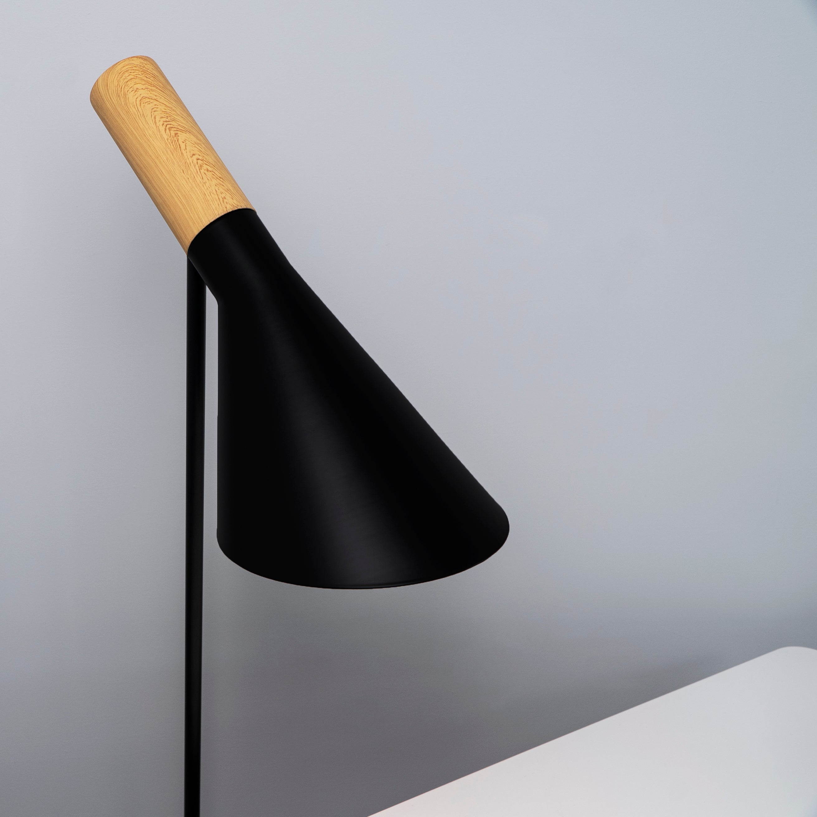 - De staande lamp is van het merk QUVIO en verkrijgbaar in de kleuren zwart en wit, gecombineerd met hout. De lamp heeft een E27 fitting.