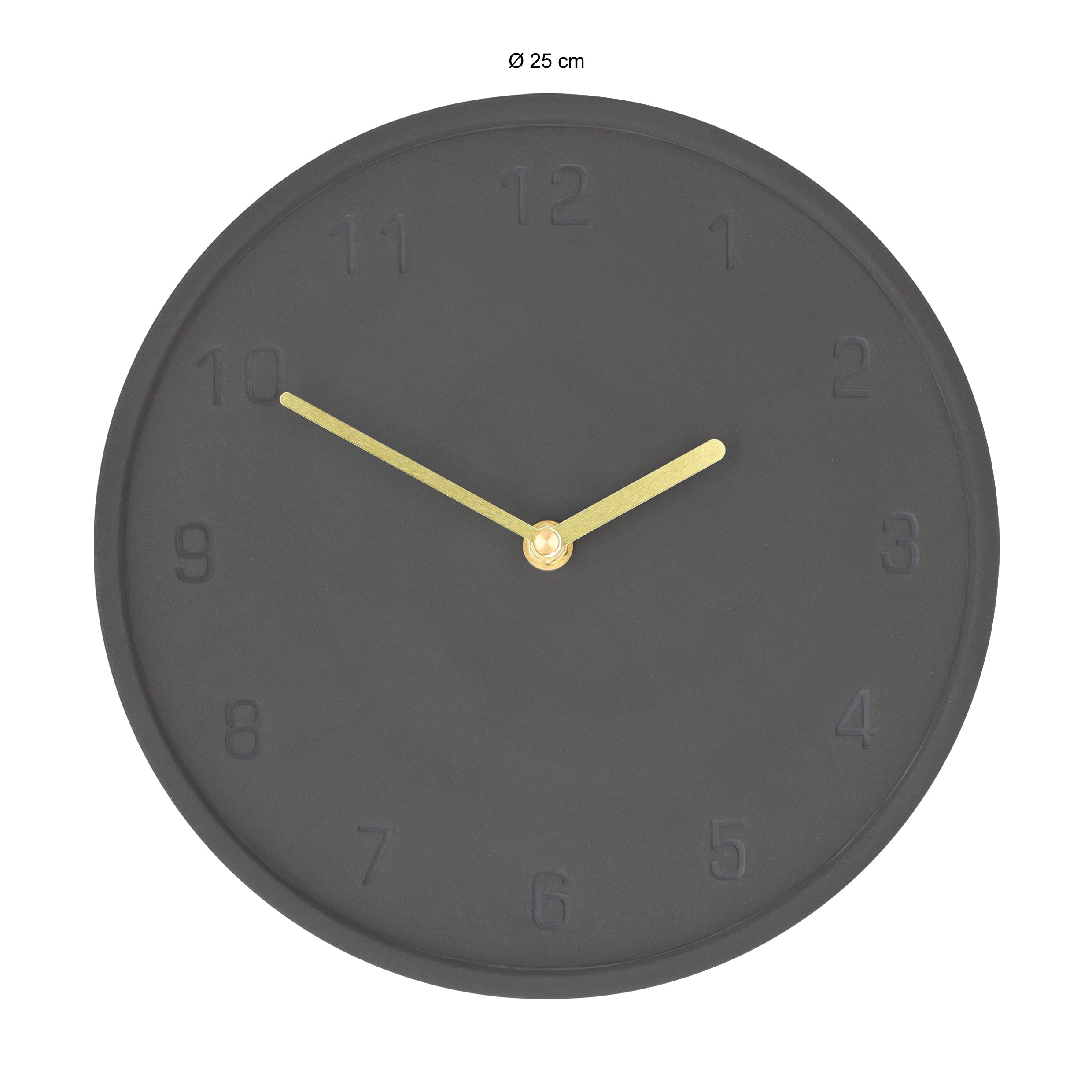 - Het goud van de wijzers steekt mooi af tegen het antraciet van het beton.