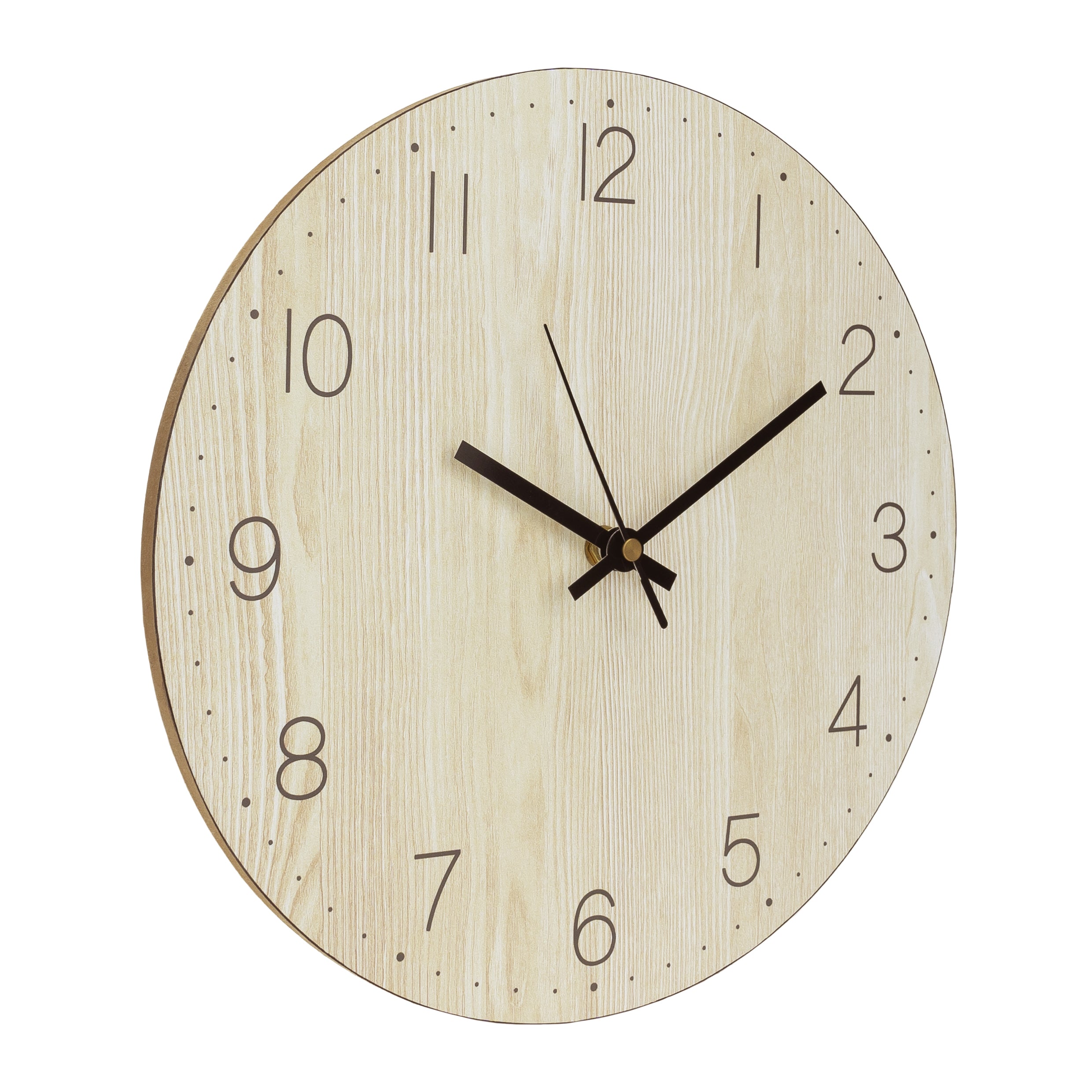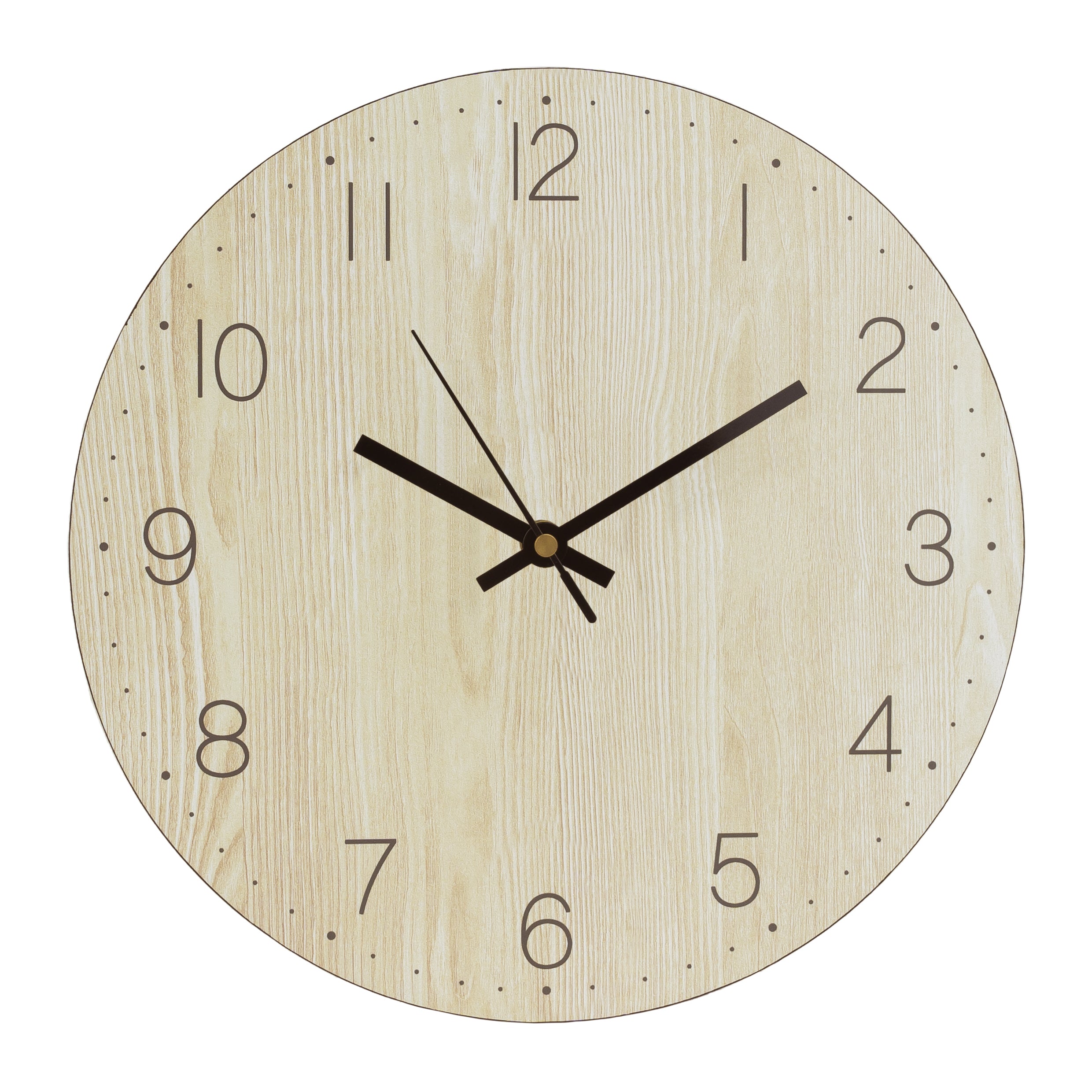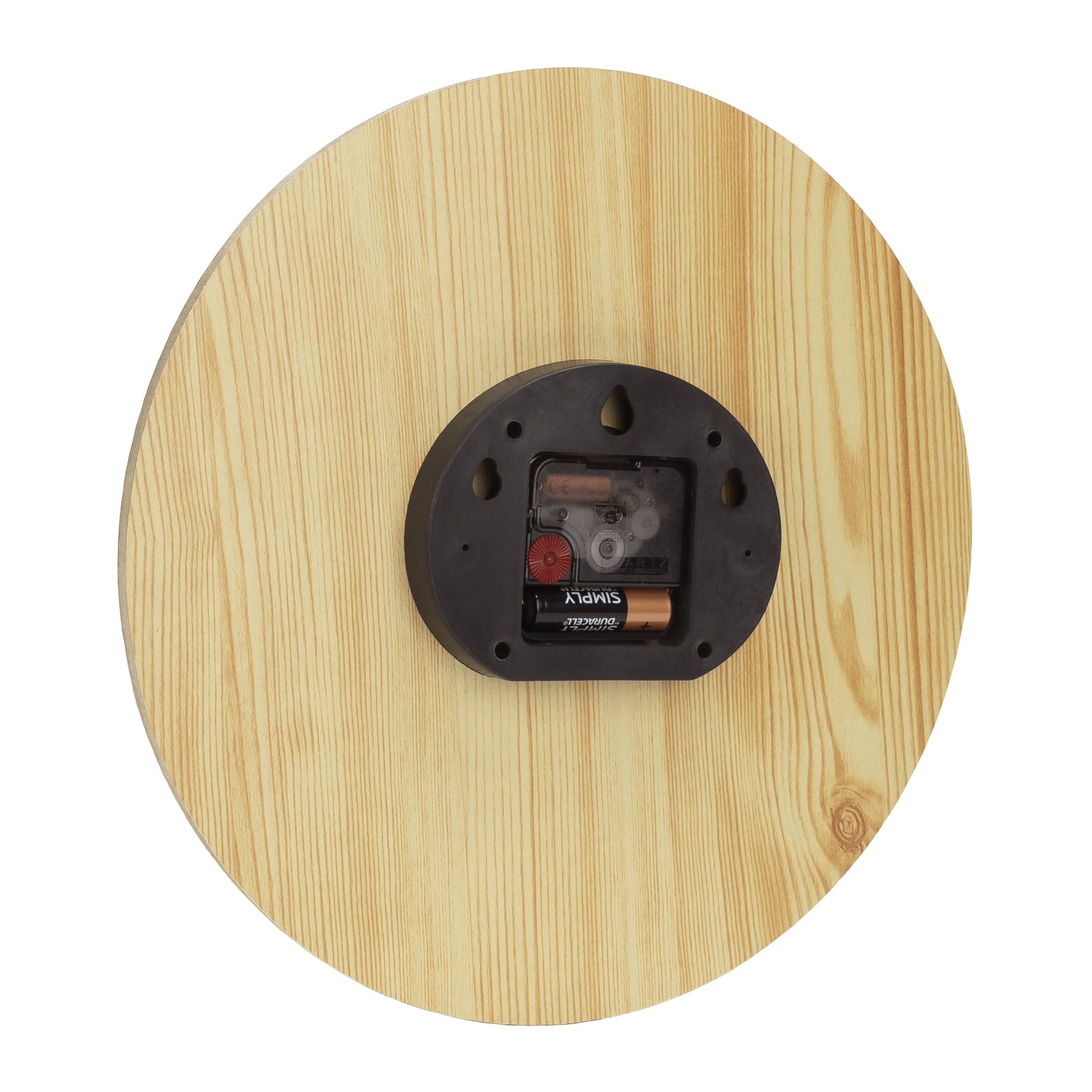 - De wandklok voor binnen is gemaakt van lichtbruin hout en heeft zwarte wijzers.