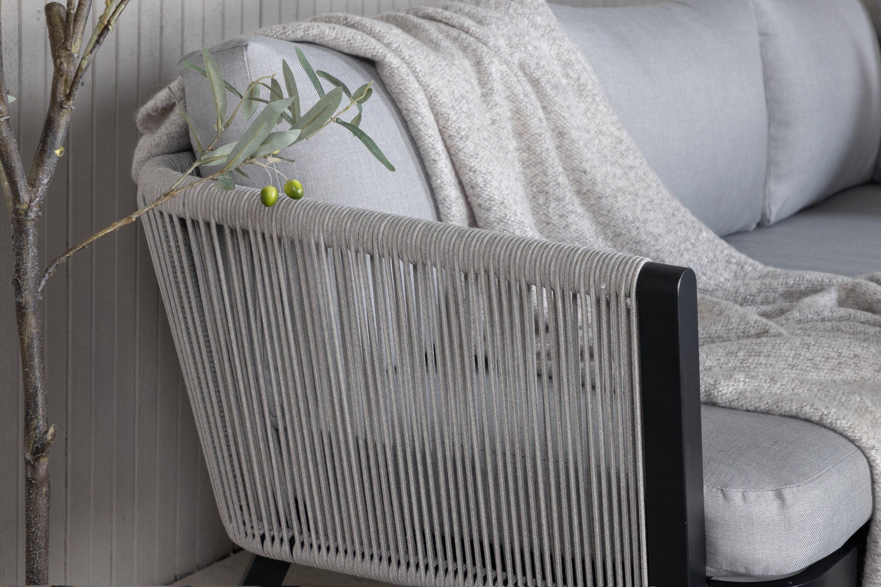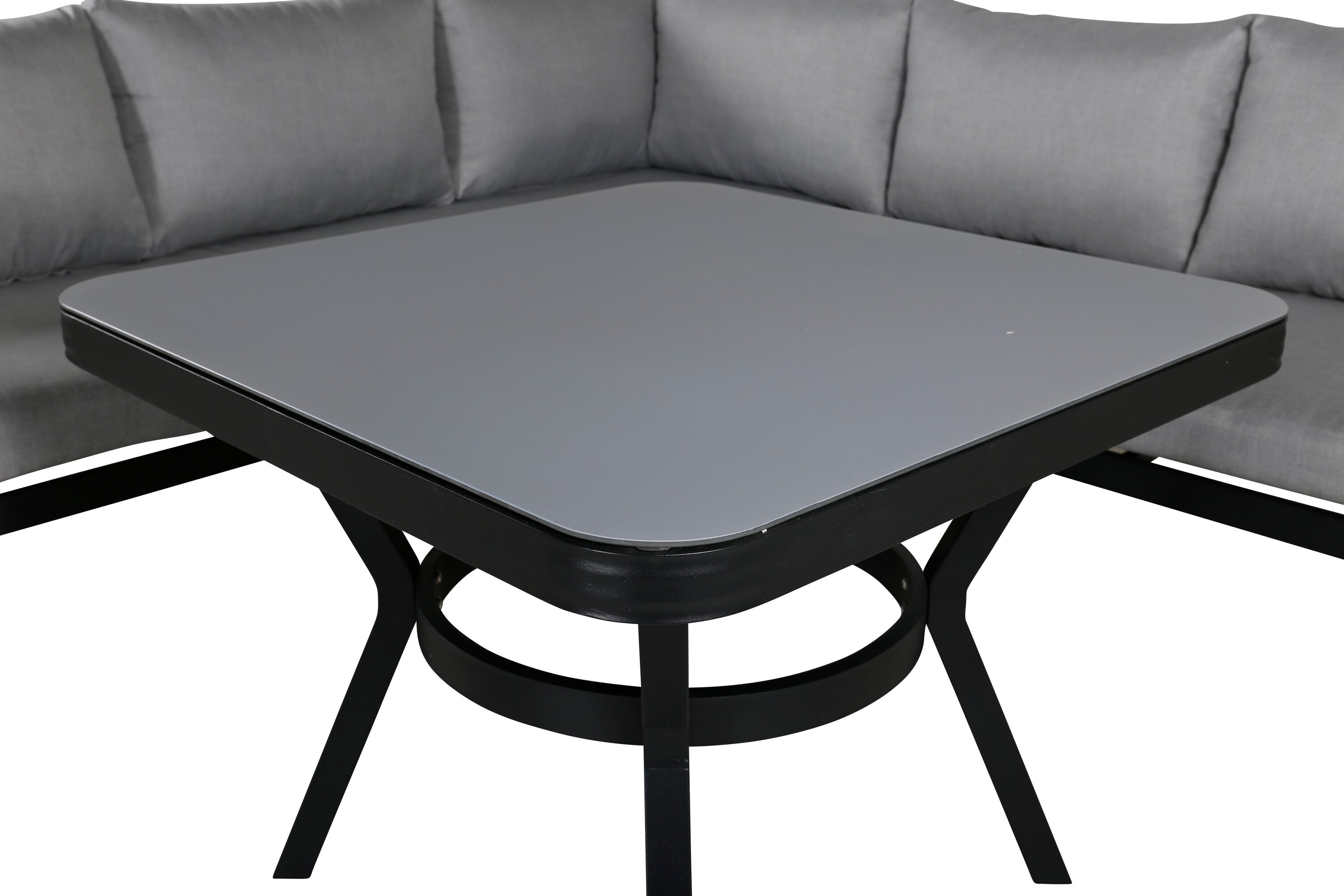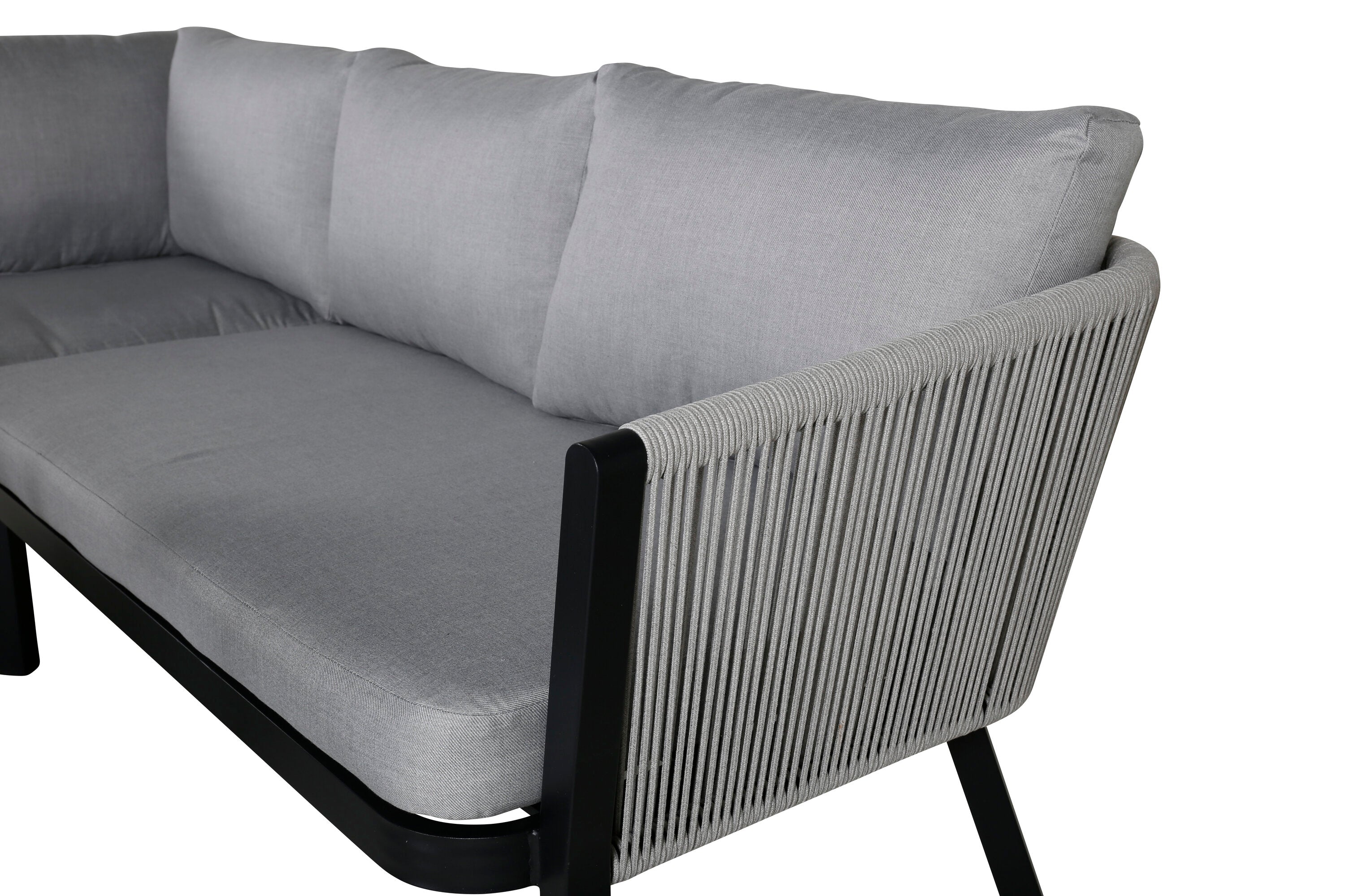 Amary is een moderne loungeset, met de nadruk op comfort en design die gegarandeerd een succes zal zijn in jouw tuin deze zomer! De loungeset bestaat uit een hoekbank gemaakt van duurzaam zwart gepoedercoat aluminuim met een rugleuning in lichtgrijze touw. De loungeset bevat ook een rechthoekige hoge salontafel met een tafelblad met een grijze afwerking en zachte, lichtgrijze kussens.