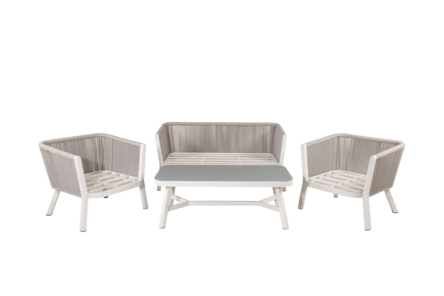 Amary is een moderne loungeset met een focus op comfort - het past perfect op het terras of het balkon. De meubelgroep bestaat uit een tweezitsbank, twee fauteuils gemaakt van wit gepoedercoat aluminium met een rug ontworpen in lichtgrijs touw. Inbegrepen in de loungeset zijn lichtgrijze zachte kussens en een rechthoekige lage salontafel met een grijze tafelbladafwerking die past bij de touwen en de kleur van de kussens. Geniet van comfortabele zomeravonden in een aangename loungeset!