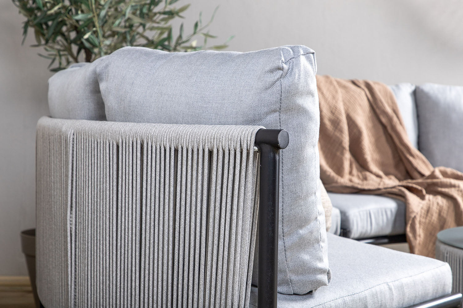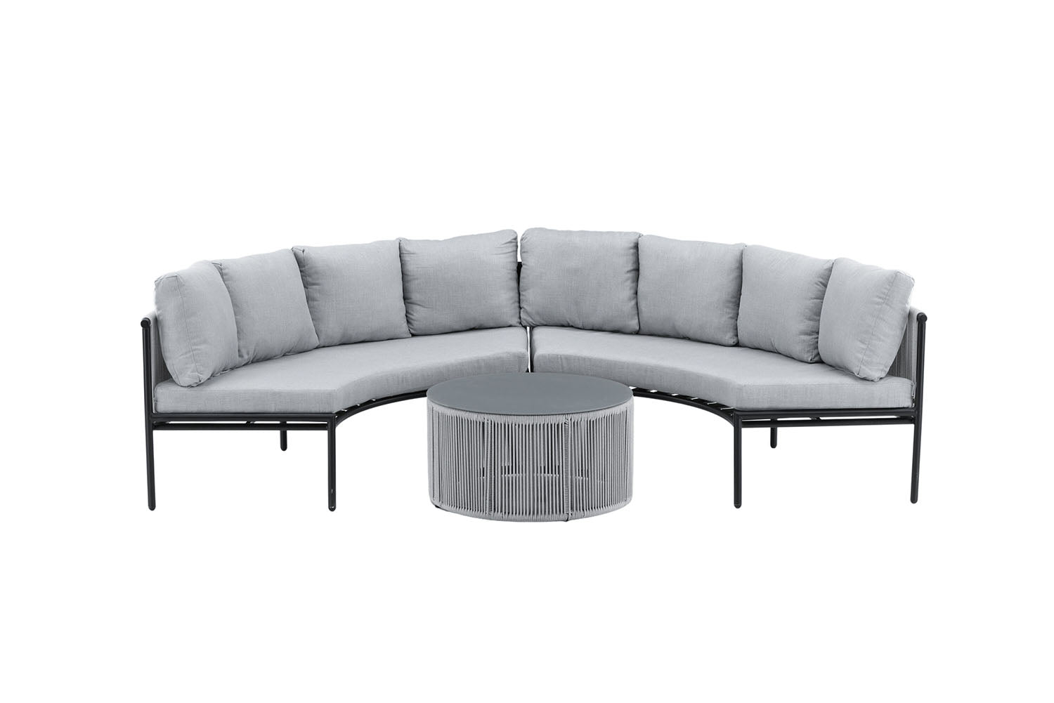 Loungeset Amary creëert de perfecte sfeer op het terras deze zomer! De bank heeft een uitnodigend design, in de vorm van een halve maan en gemaakt van duurzaam grijs touw met een frame van smal zwart staal. De loungeset bevat ook een kleinere salontafel in bijpassend design en zachte zitkussens. Geniet van comfortabele momenten buiten!